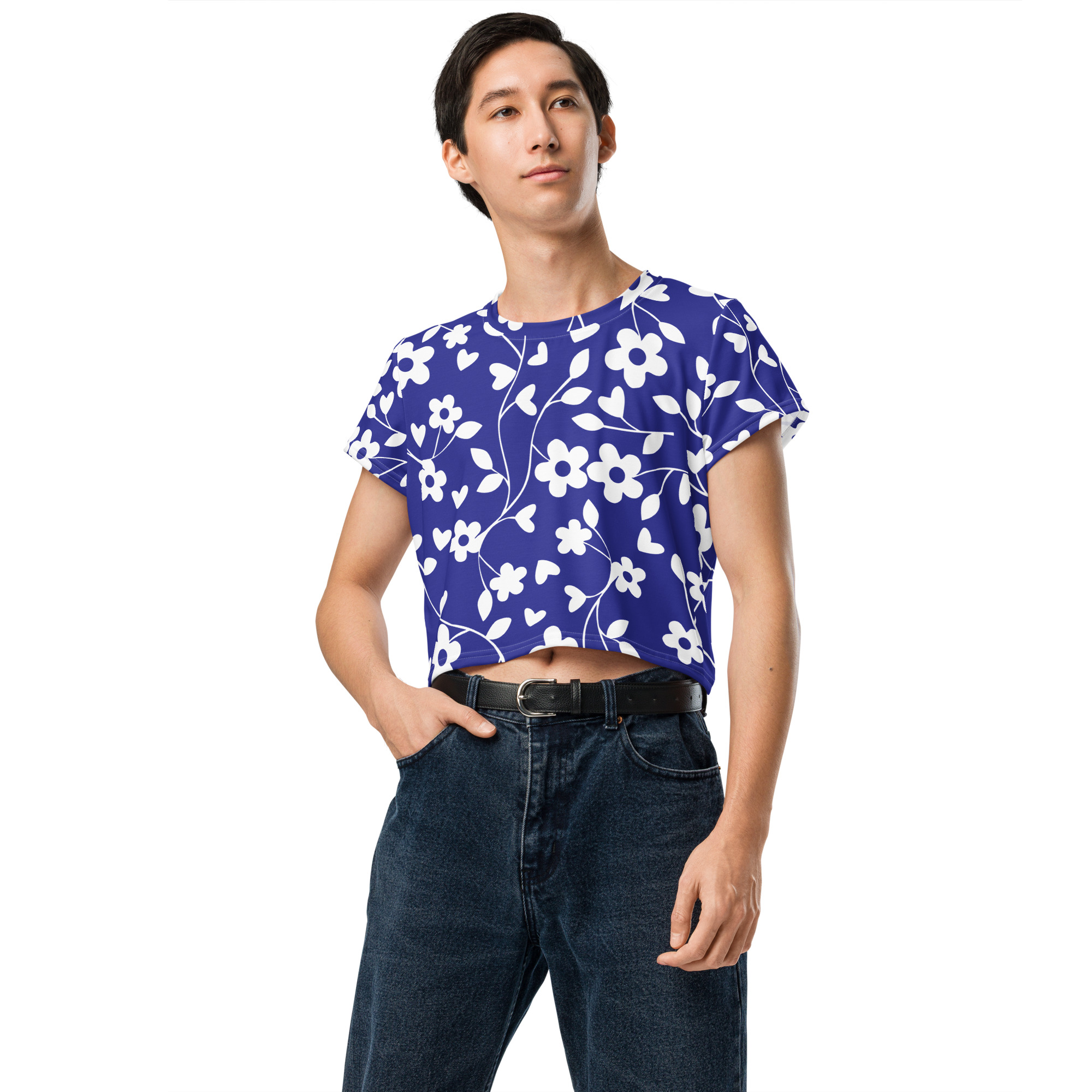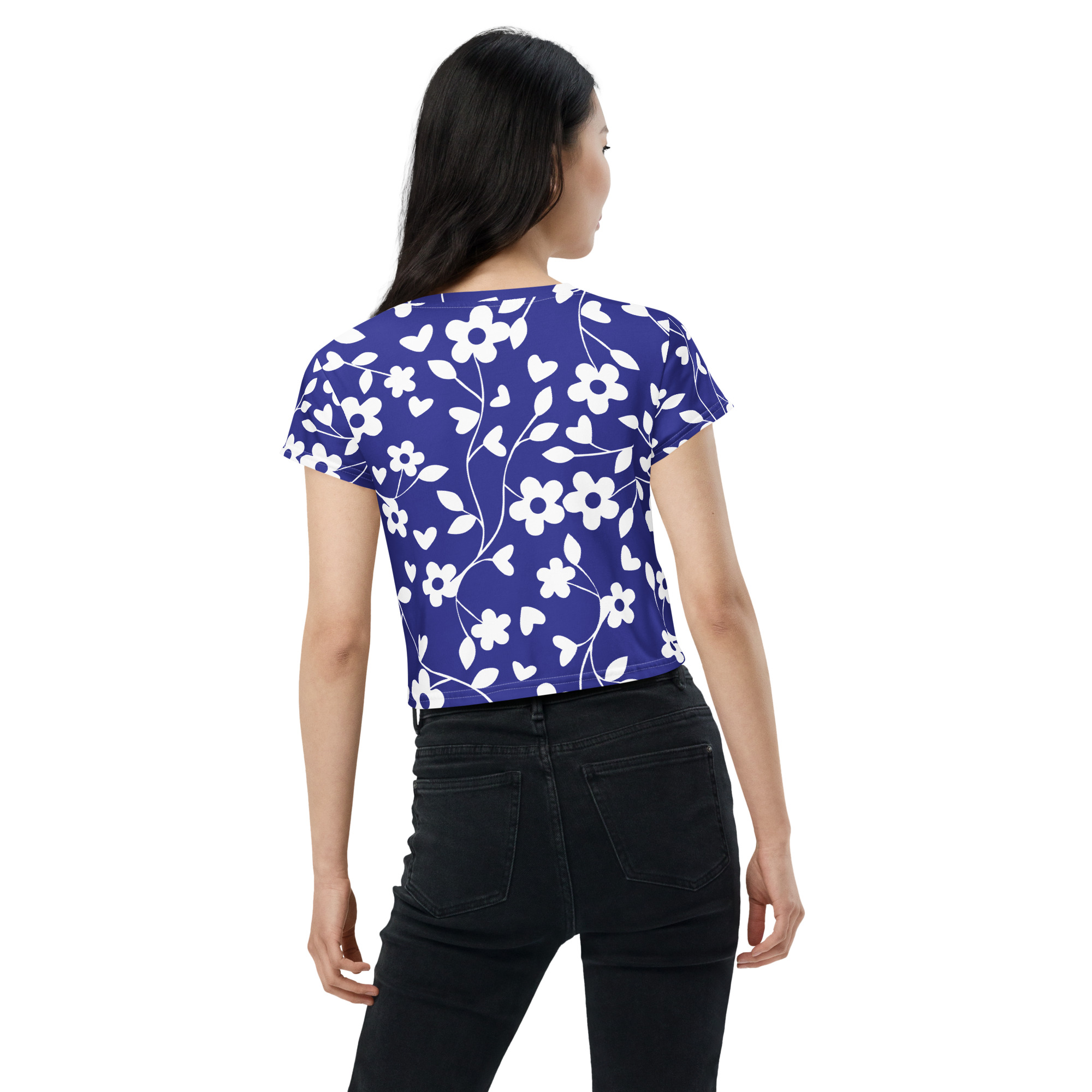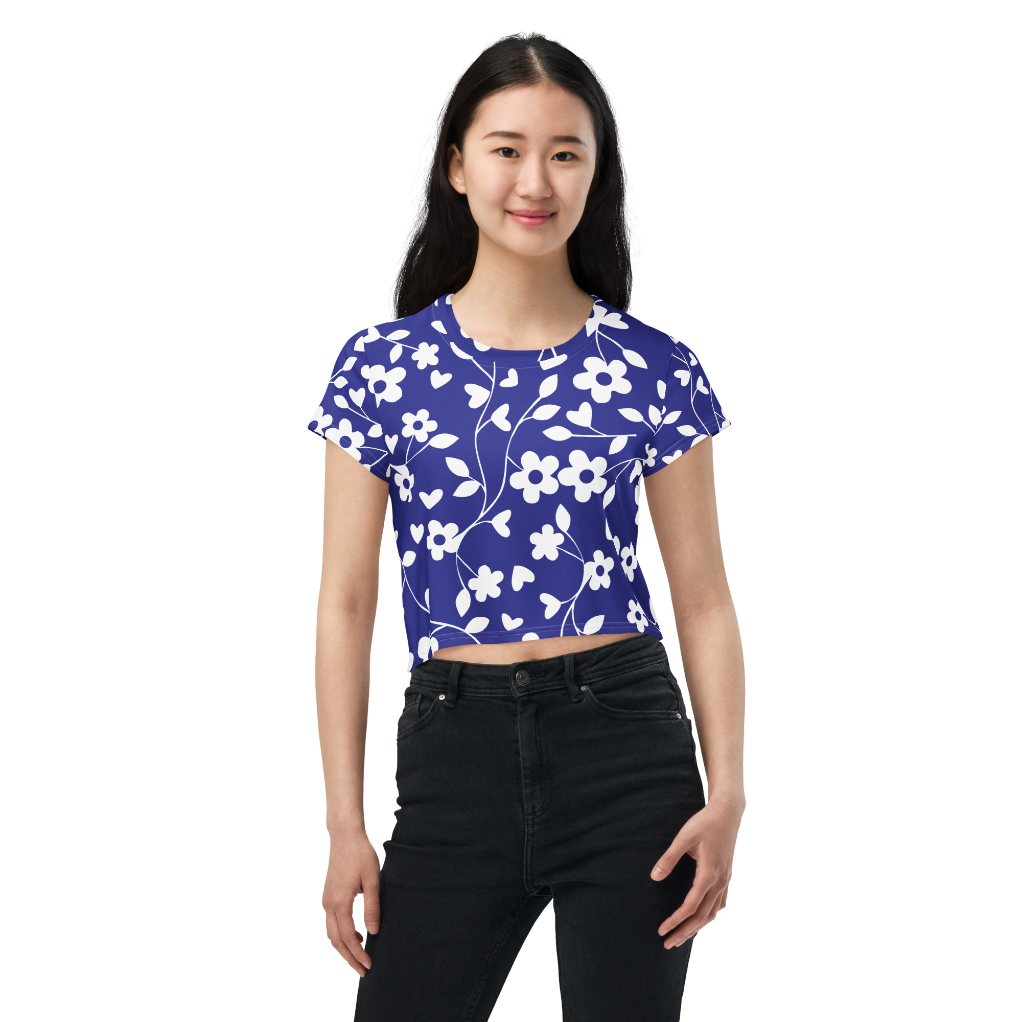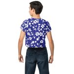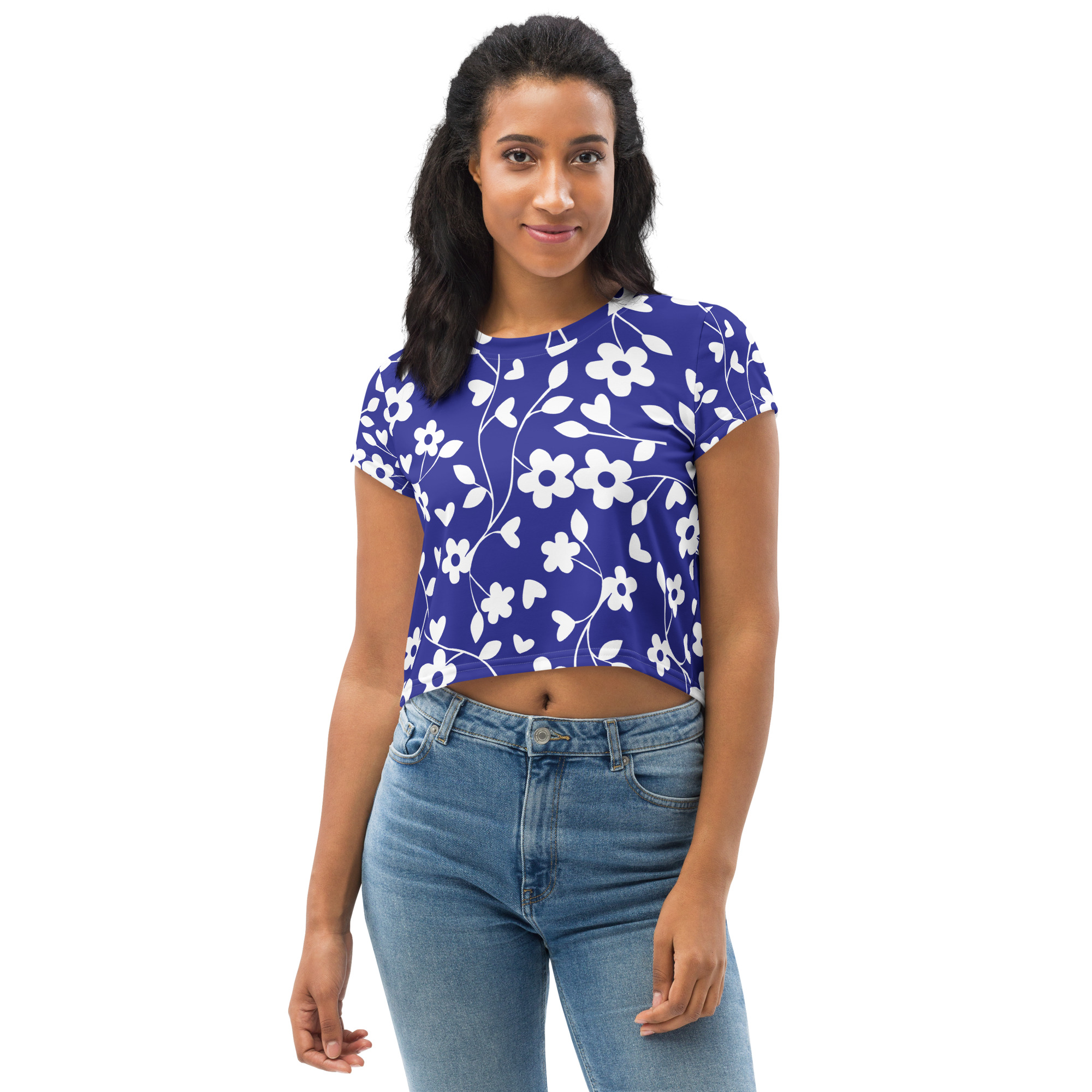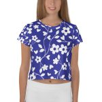 Blue floral pattern All Over Print Crop Tee for women. Looking for you next wardrobe favorite? Well, look no further because this crop tee is printed and sewn to fit you just right. To top that off, the original all-over design is definitely worth showing off, so don’t hesitate to own one of these tees – they’re meant to be adored.