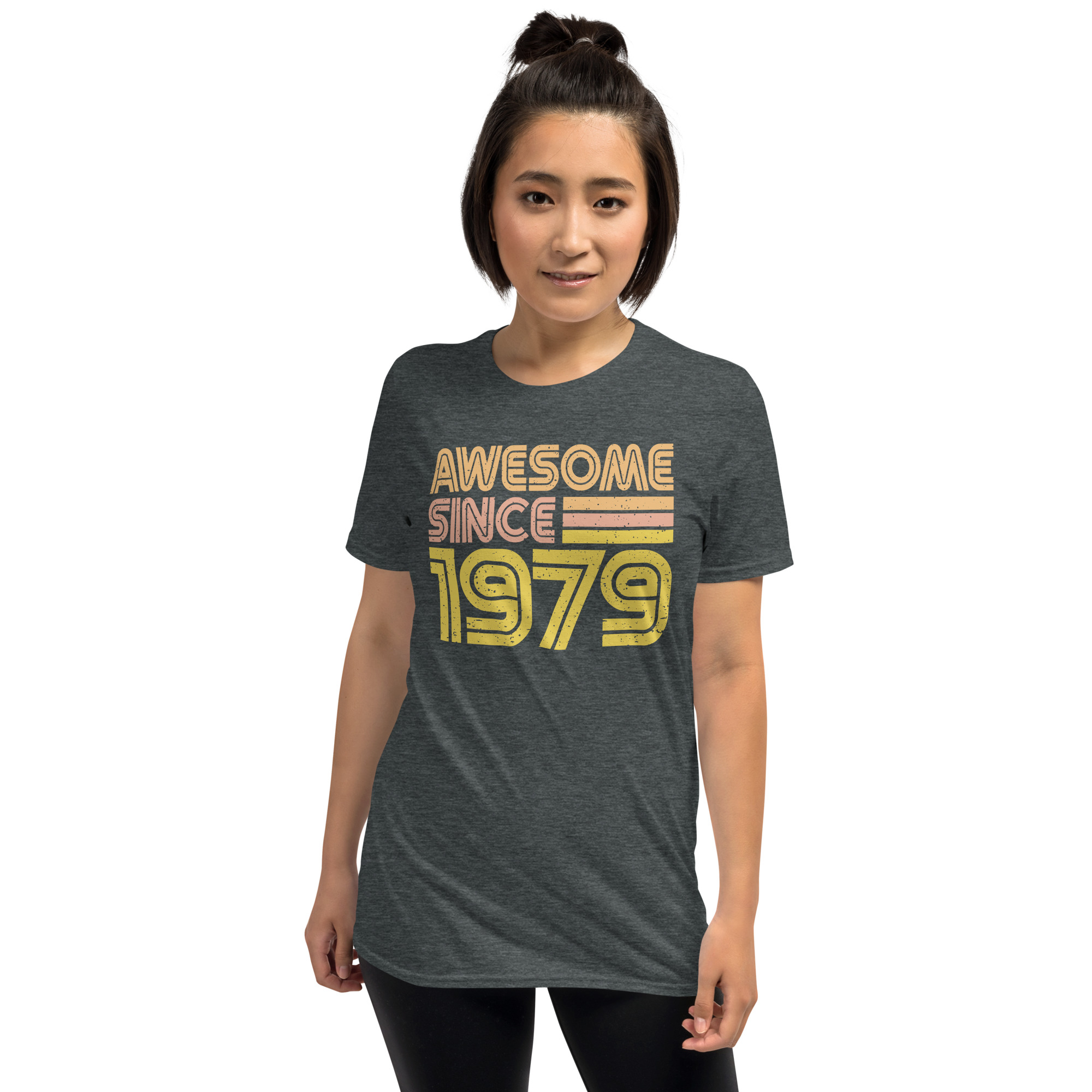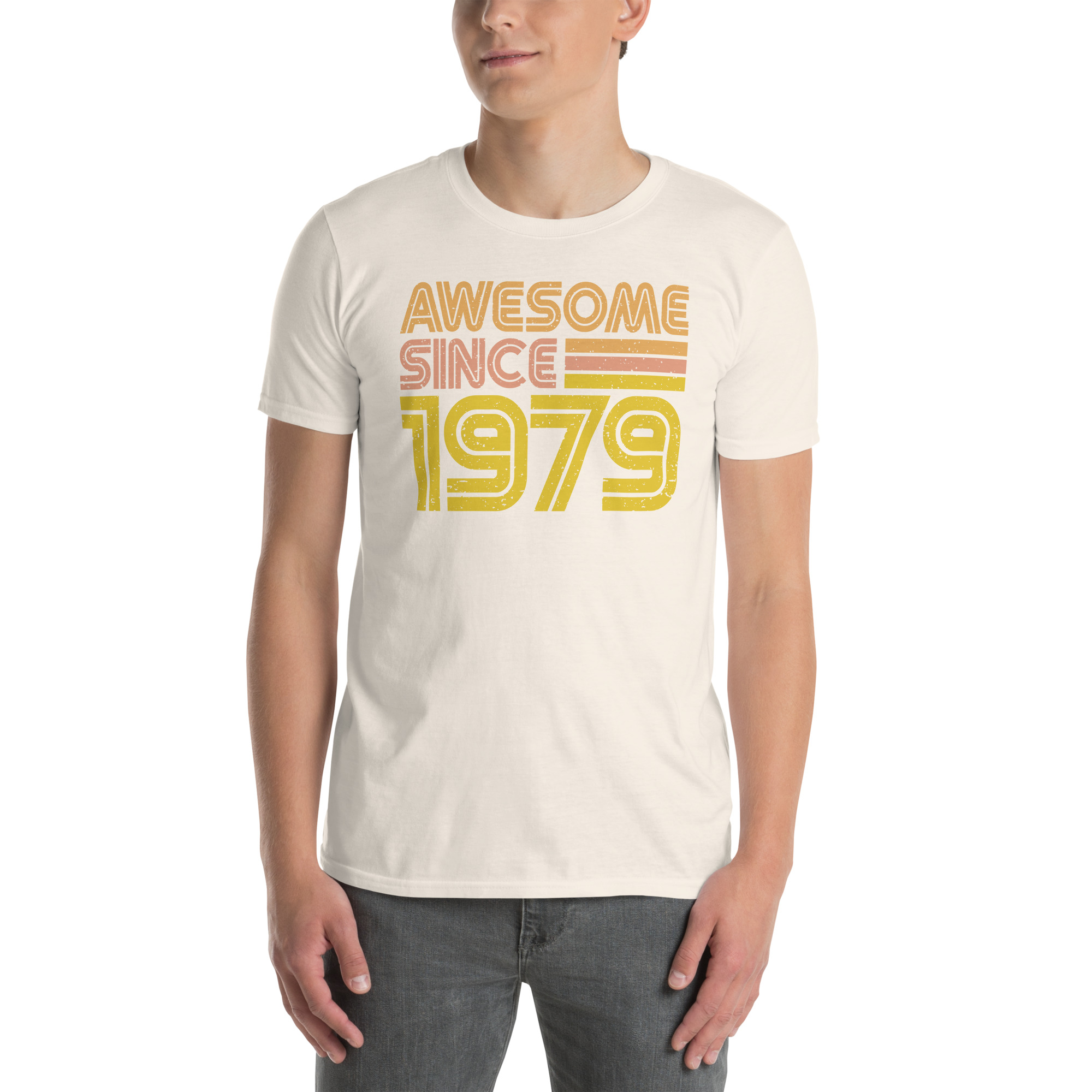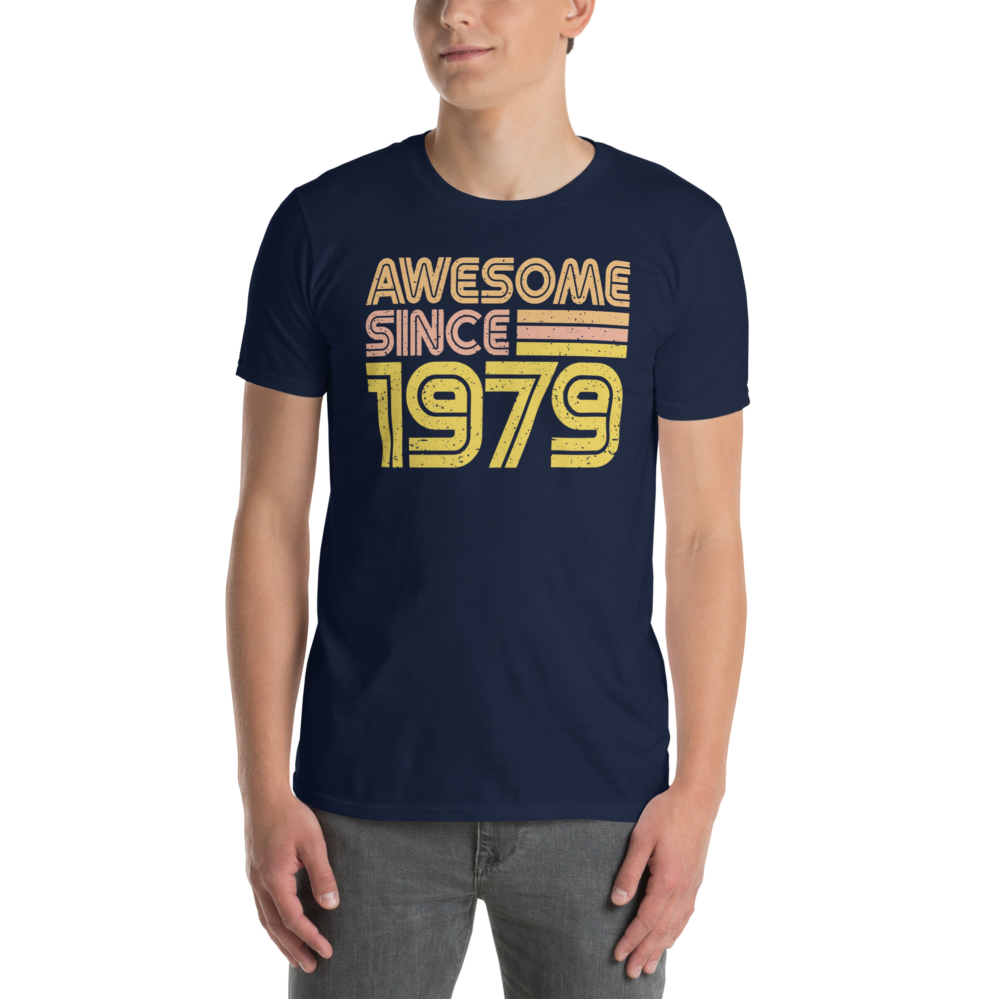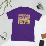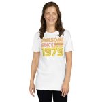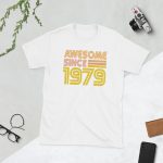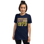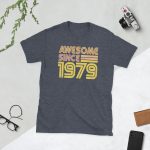 Awesome since 1979, Birth year, Short-Sleeve Unisex T-Shirt. You’ve now found the staple t-shirt of your wardrobe. It’s made of 100% ring-spun cotton and is soft and comfy. The double stitching on the neckline and sleeves add more durability to what is sure to be a favorite!