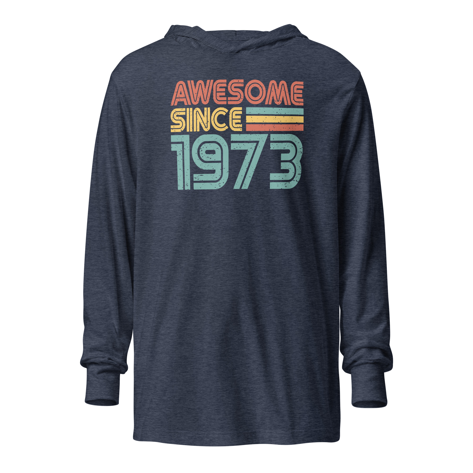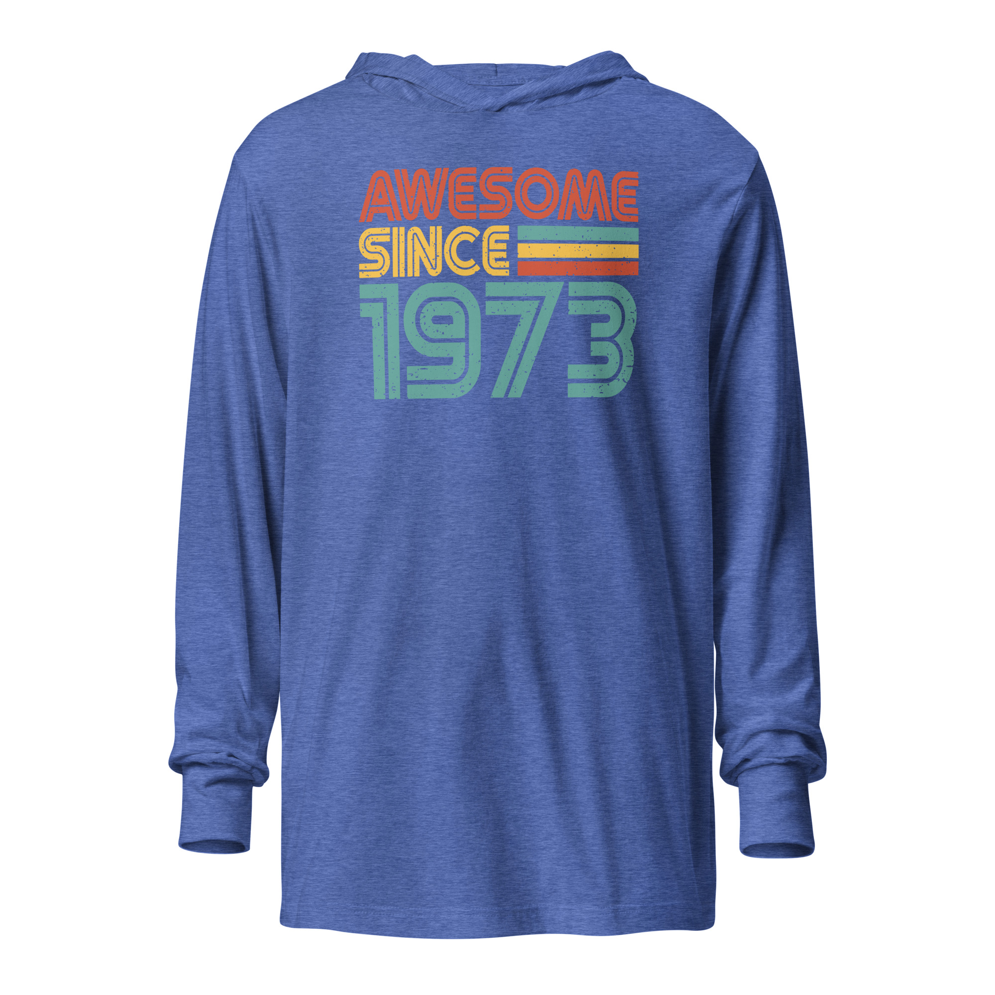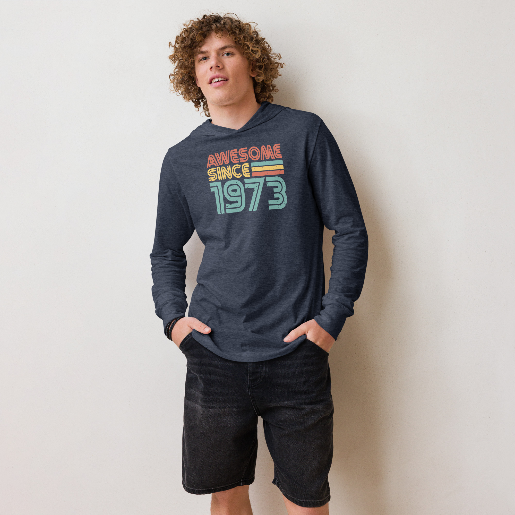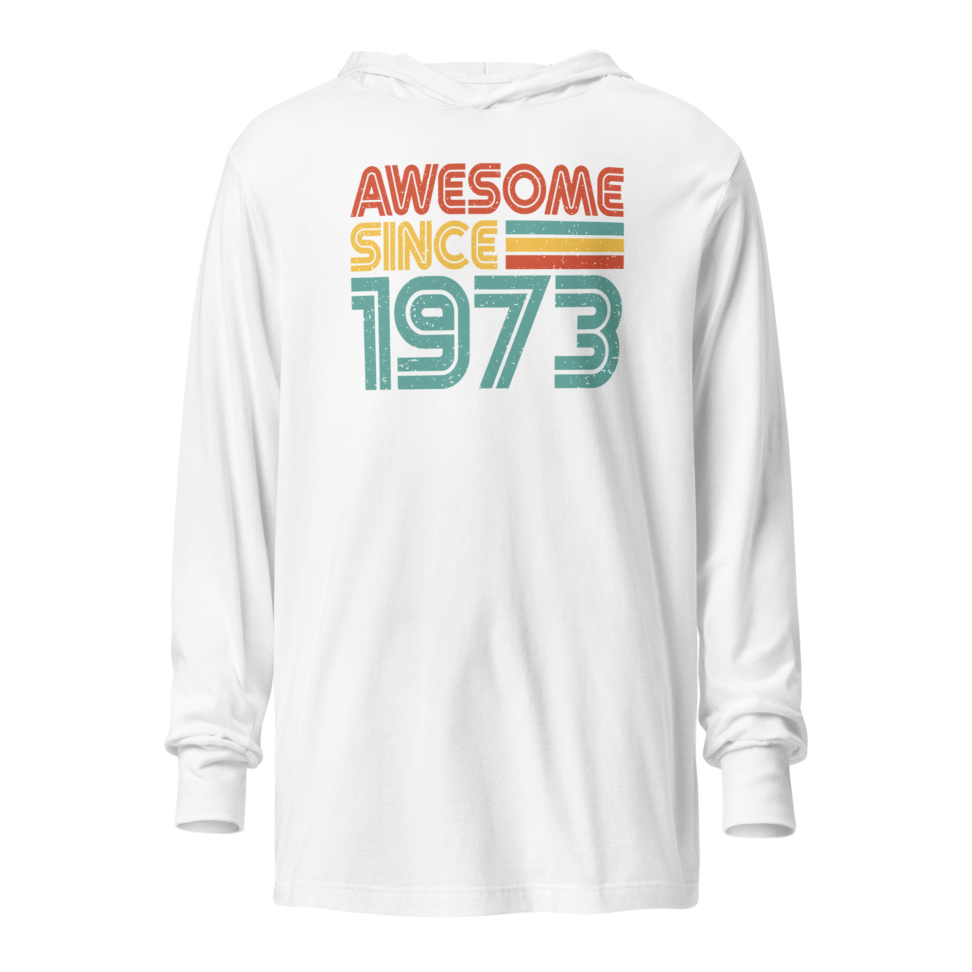 Awesome since 1973 text printed Hooded Long Sleeve Tee, Unisex long sleeve hoodie. With its long sleeves and comfortable hood, this tee is perfect for layering, allowing you to create stylish outfits all year round. Plus, its lightweight construction allows for unrestricted movement, ensuring that you feel at ease no matter the occasion.