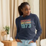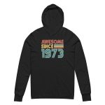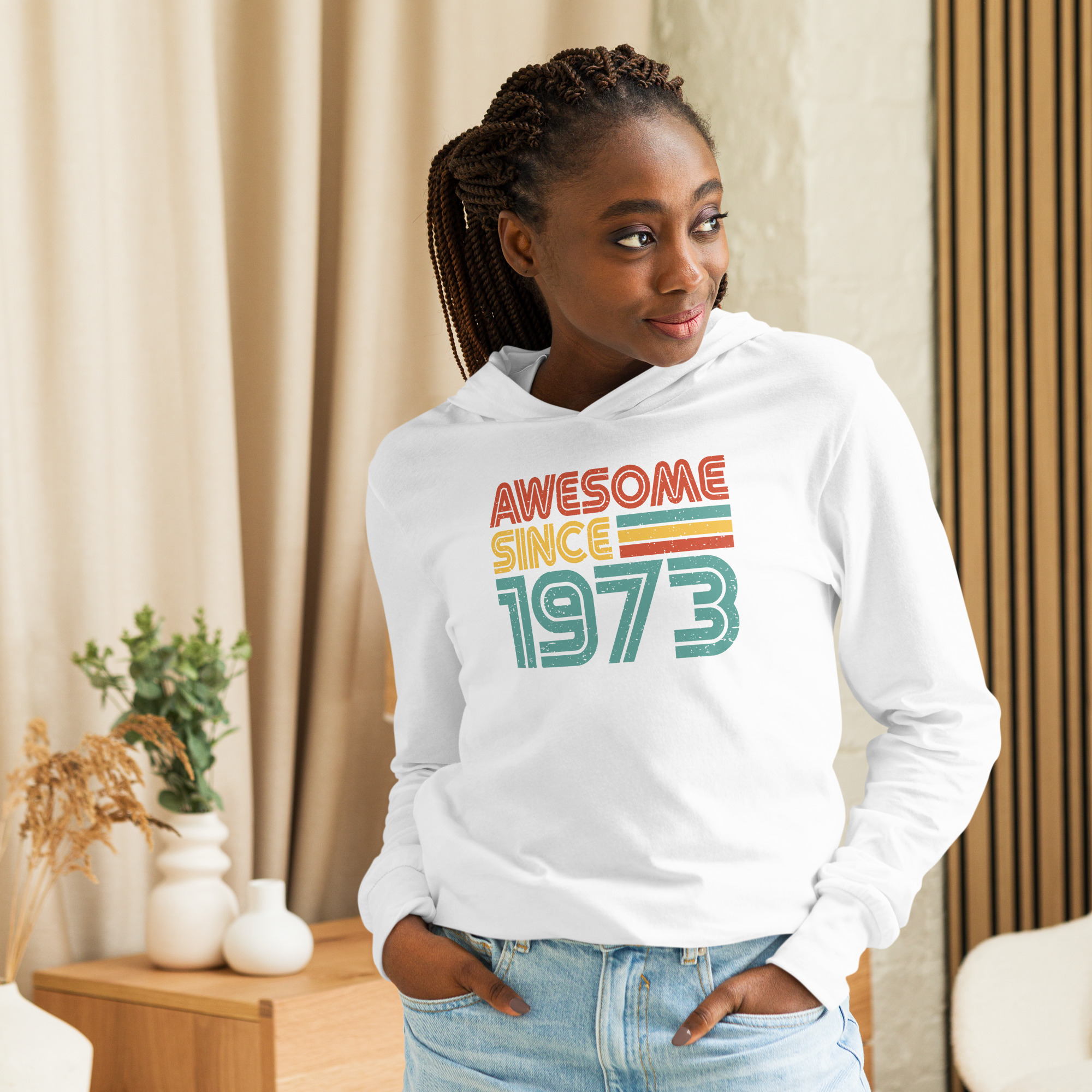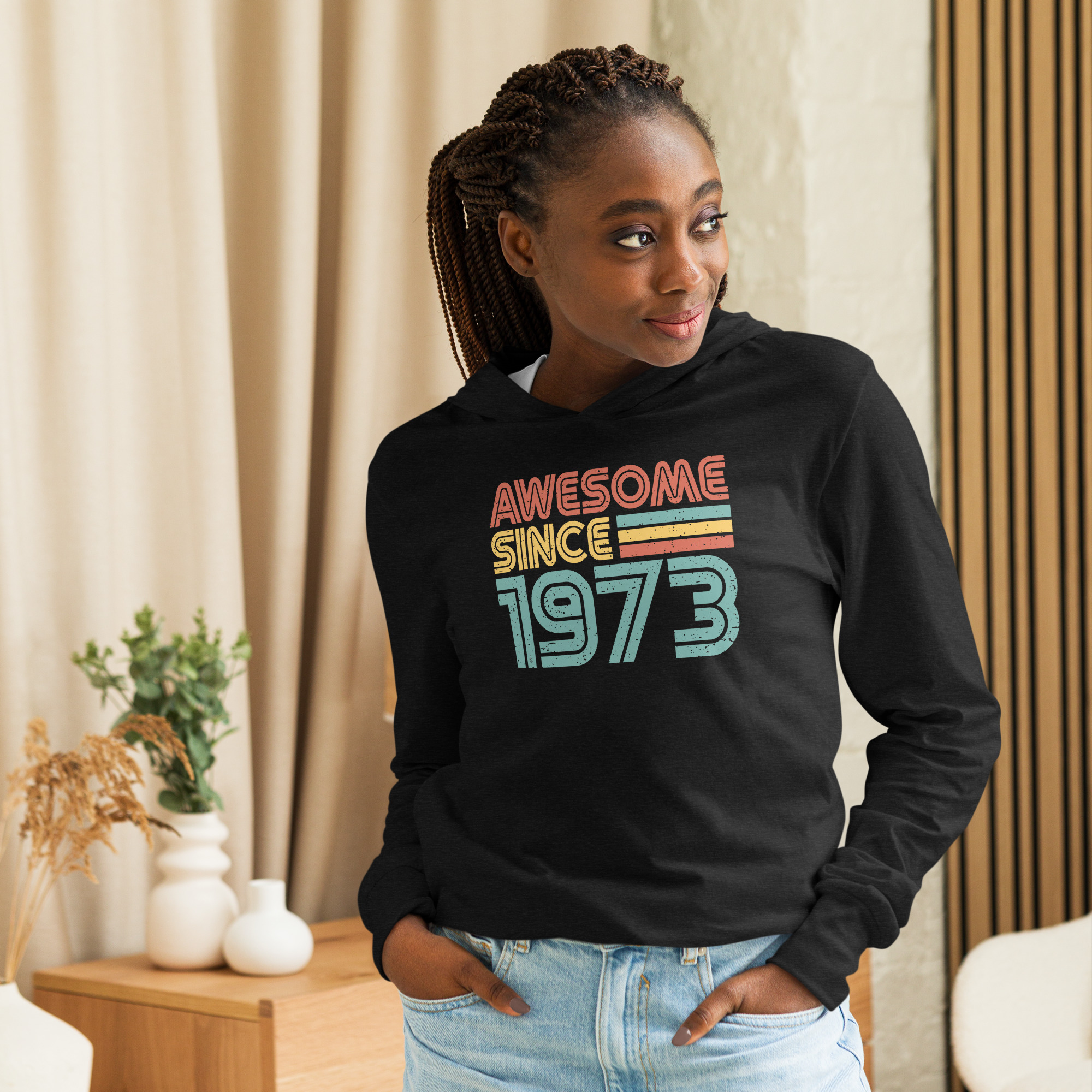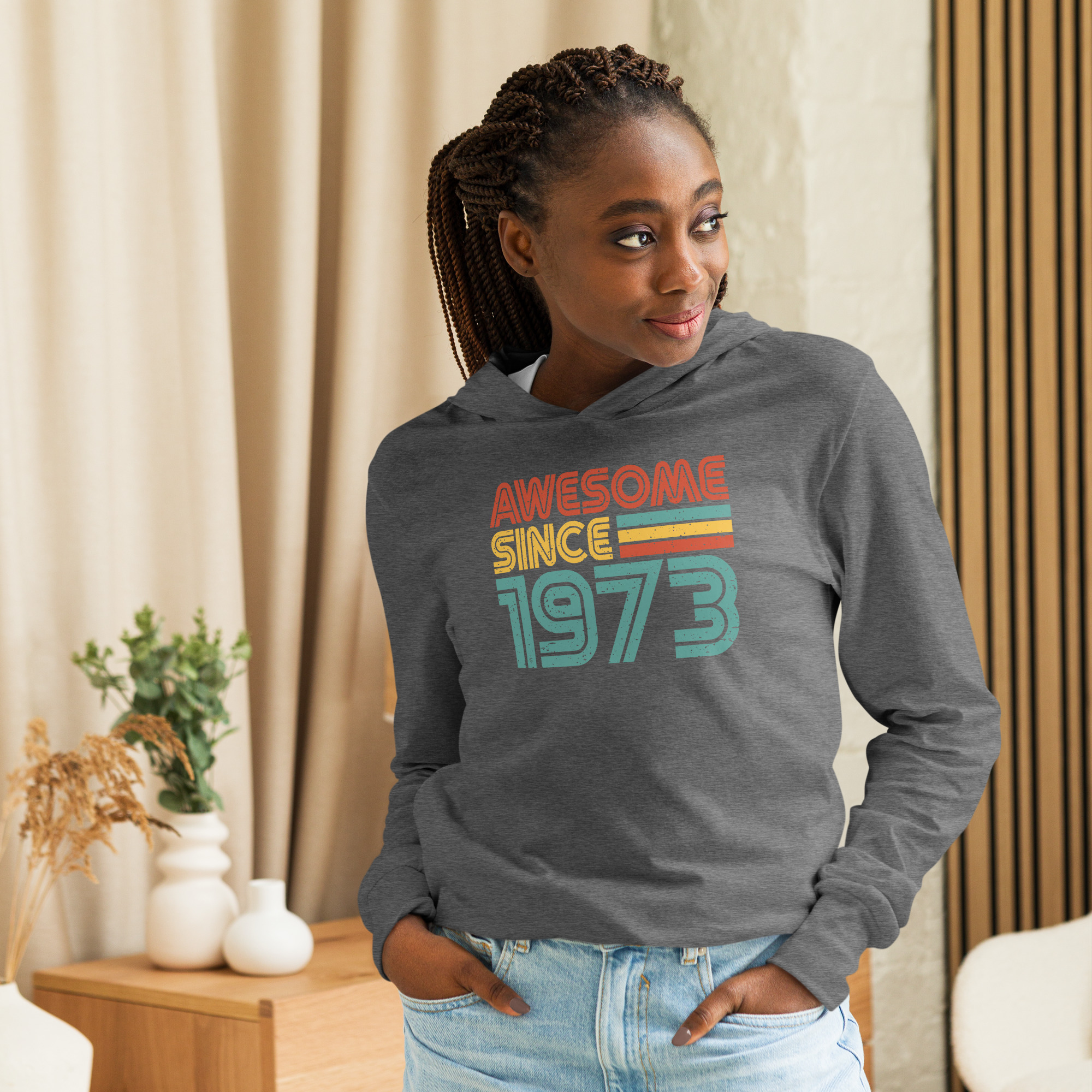 Awesome since 1973 text printed Hooded Long Sleeve Tee, Unisex long sleeve hoodie. With its long sleeves and comfortable hood, this tee is perfect for layering, allowing you to create stylish outfits all year round. Plus, its lightweight construction allows for unrestricted movement, ensuring that you feel at ease no matter the occasion.