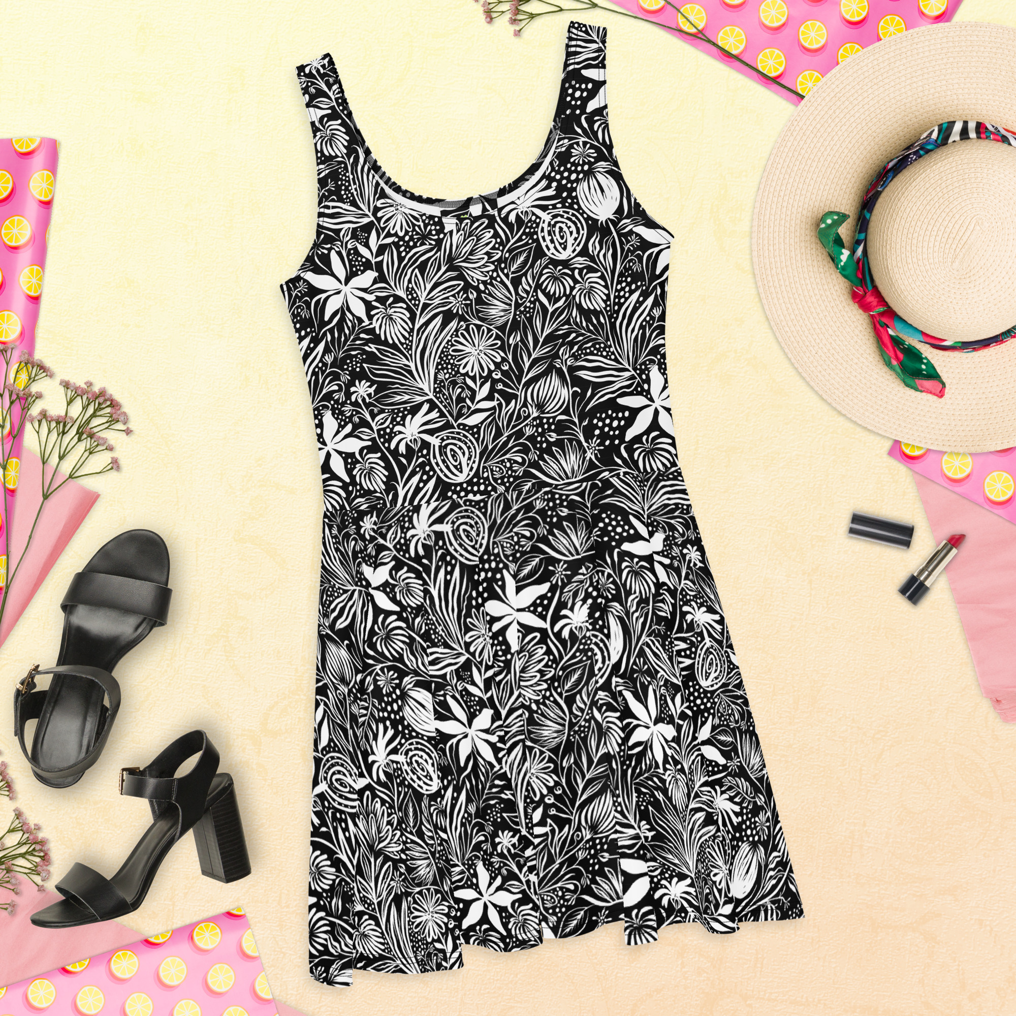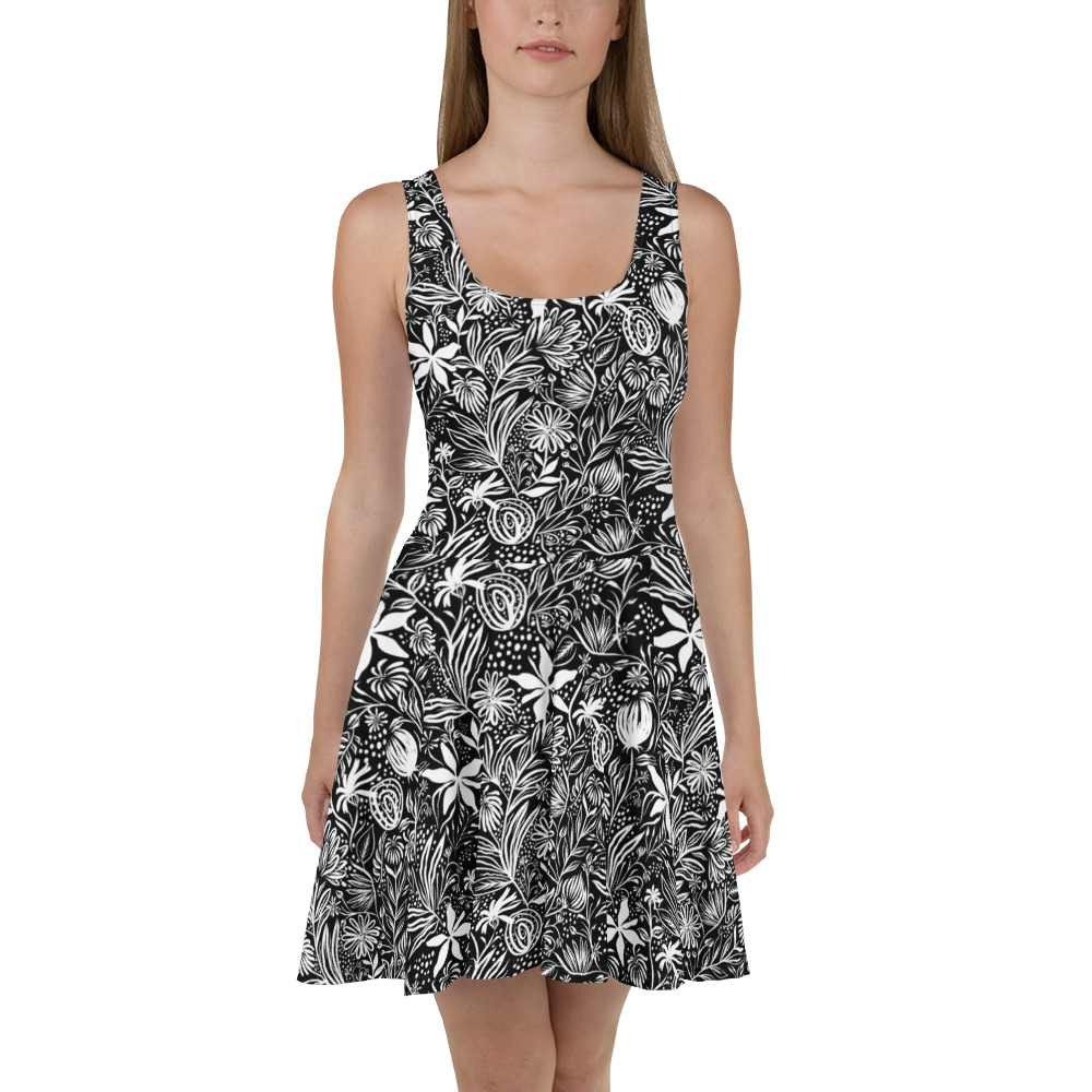 Black floral pattern All over print Skater Dress for women. Dress to impress with this sleeveless skater dress! The soft fabric and flared skirt give it an elegant twist that brings out the intricate design with a beautiful vibrancy.