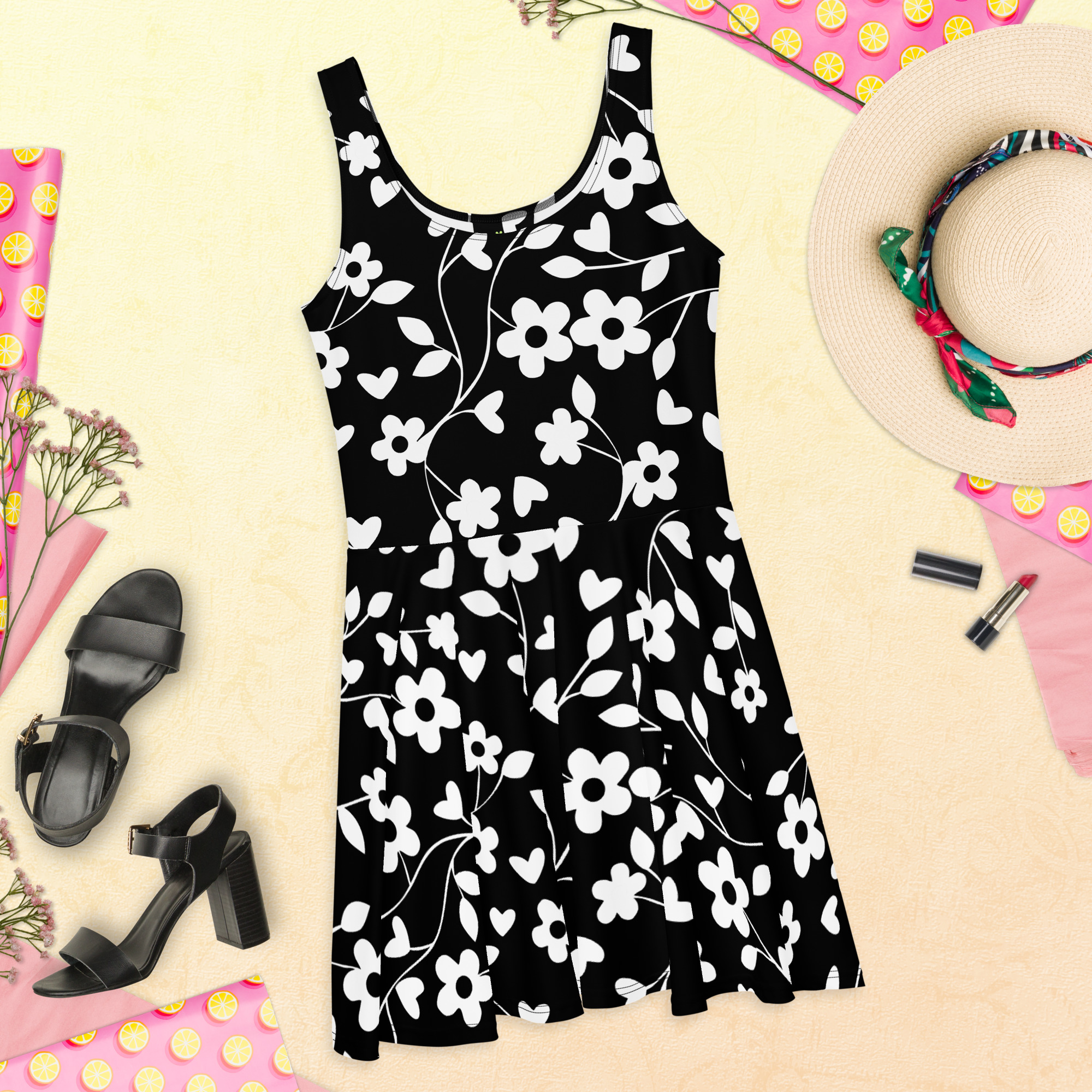Black Floral pattern All over print Skater Dress for women. Dress to impress with this sleeveless skater dress! The soft fabric and flared skirt give it an elegant twist that brings out the intricate design with a beautiful vibrancy.