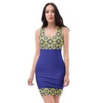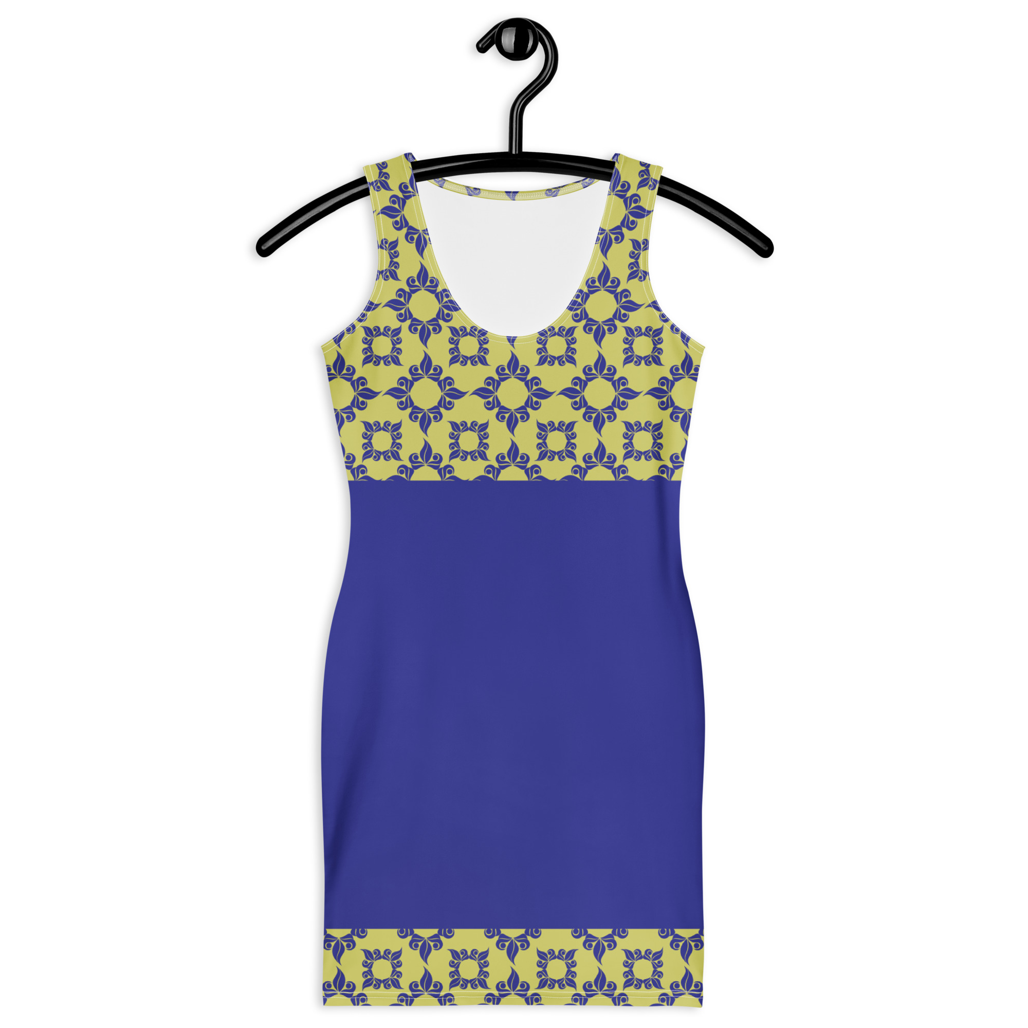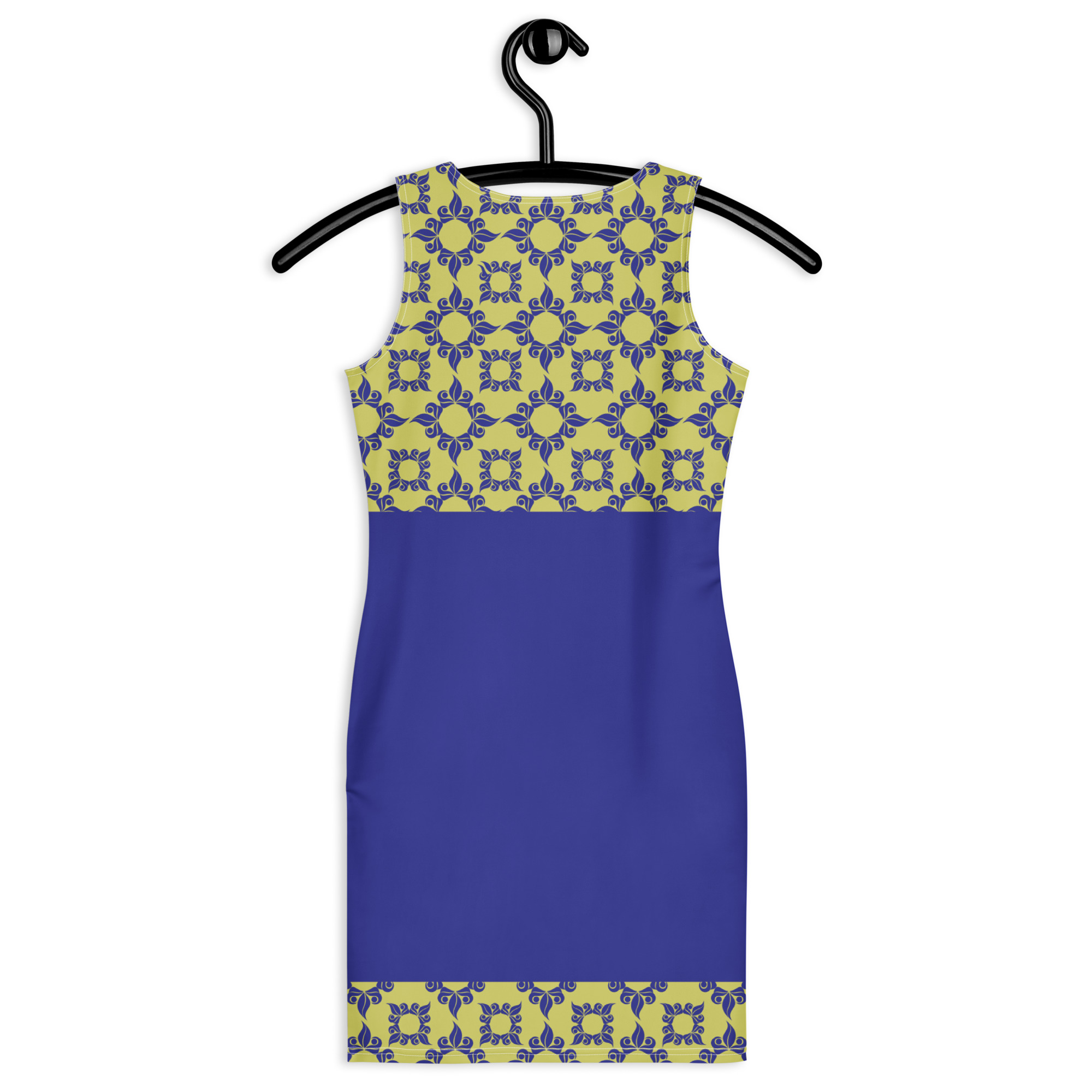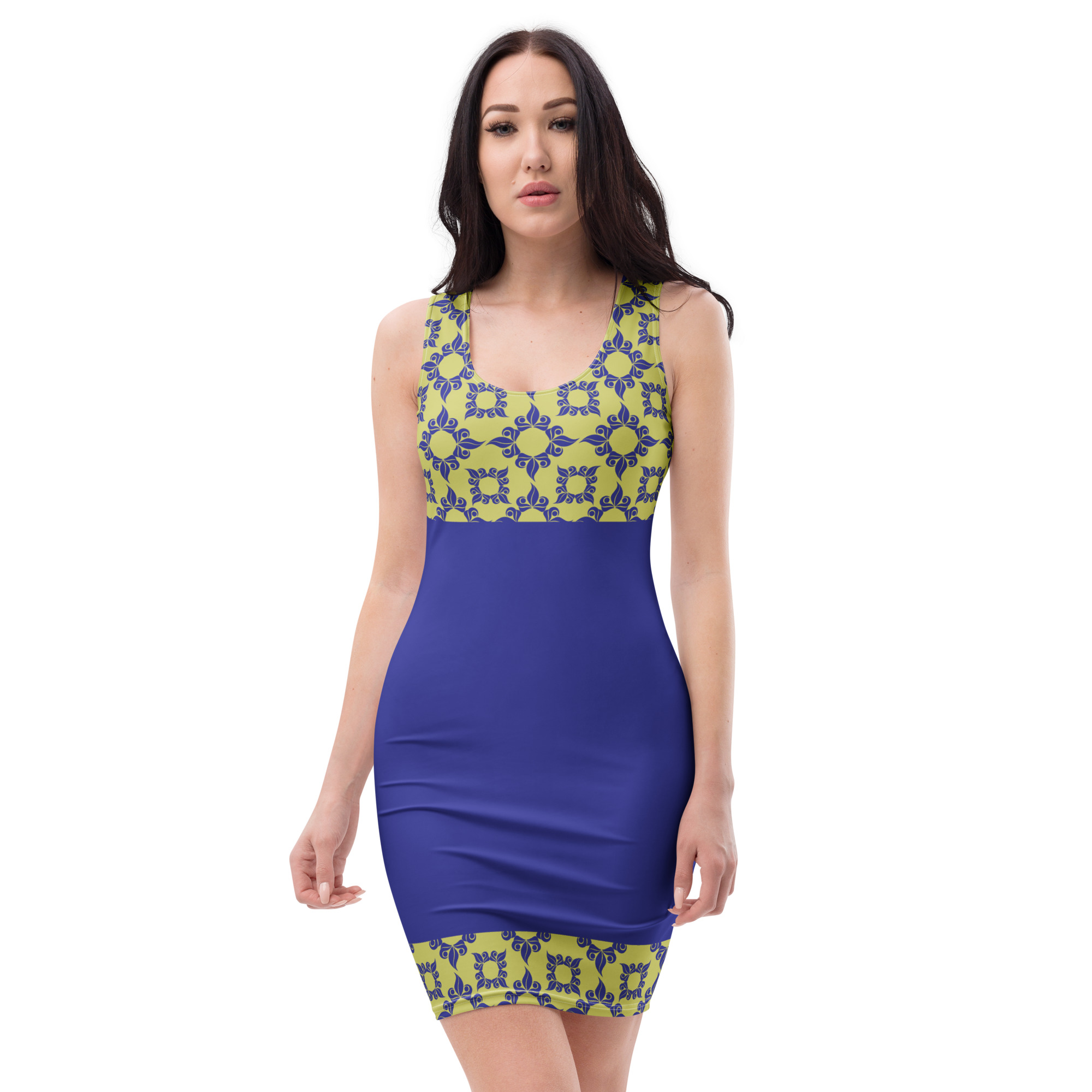 Blue and Gold pattern All over print Bodycon dress. Make a statement and look fabulous in this all-over printed, fitted dress.