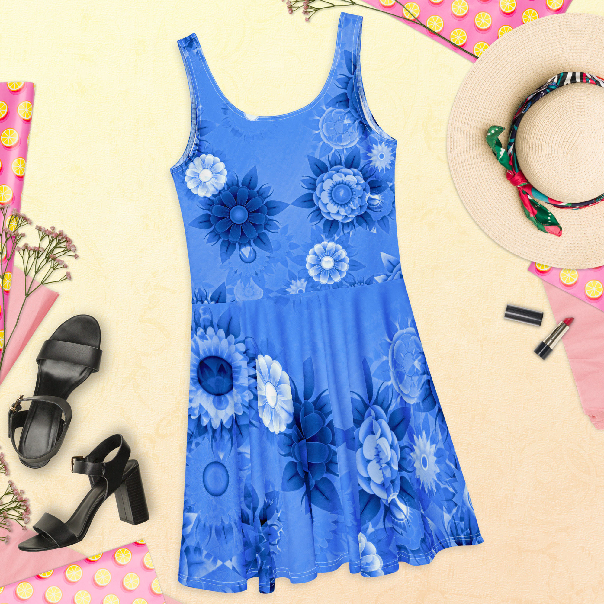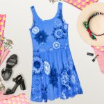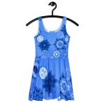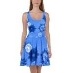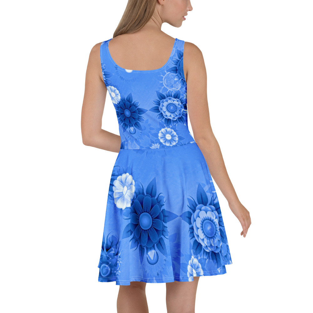 Blue floral design All over print Skater dress. Dress to impress with this sleeveless All over print skater dress! The soft fabric and flared skirt give it an elegant twist that brings out the intricate design with a beautiful vibrancy.