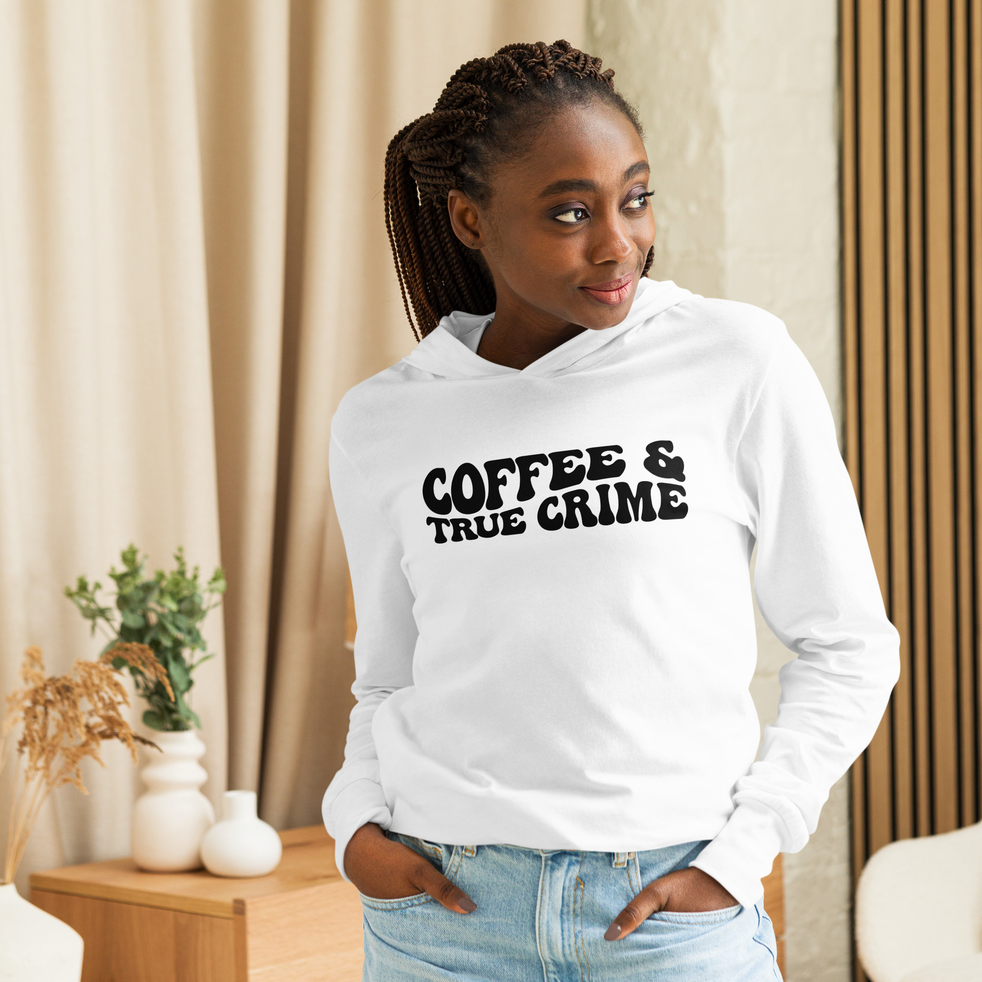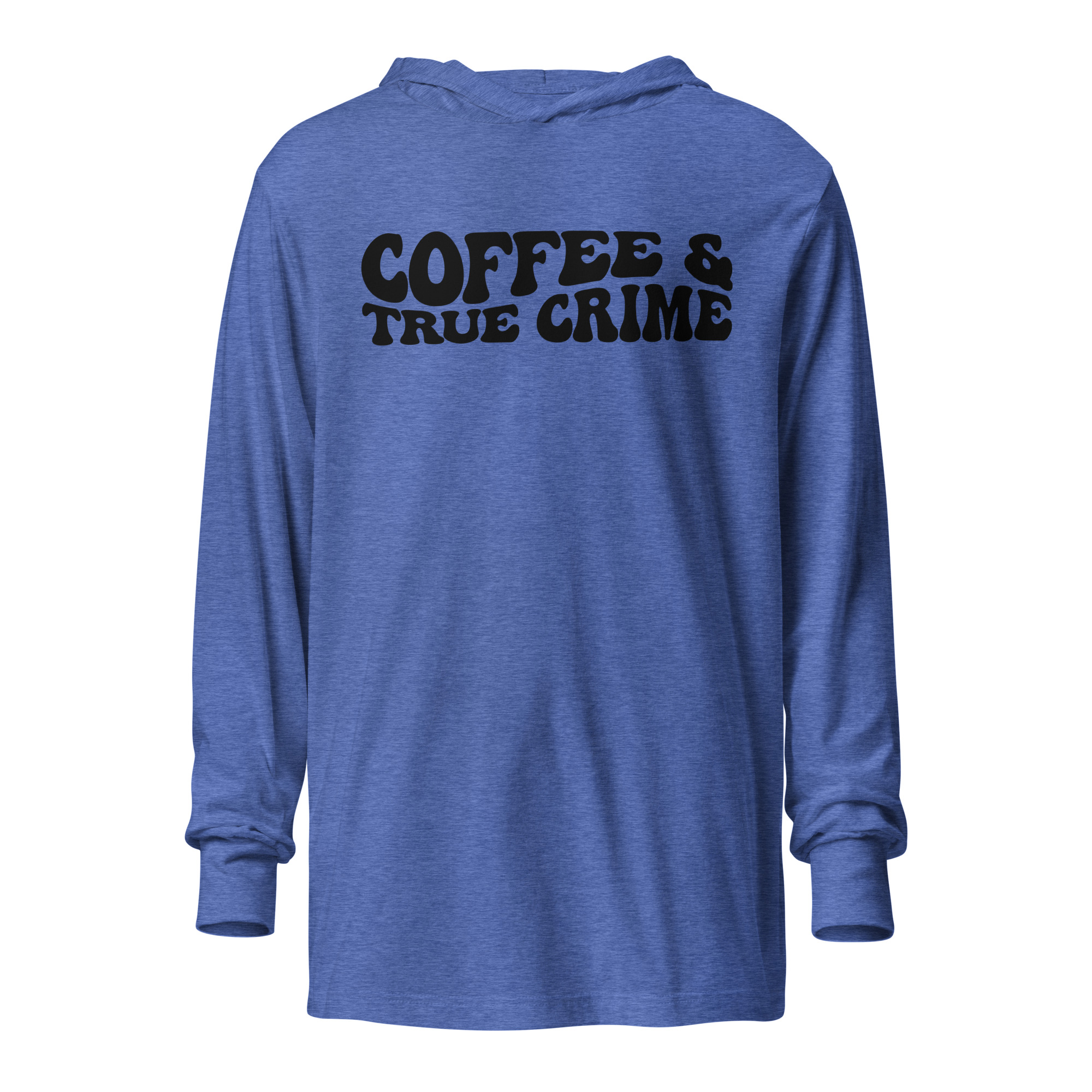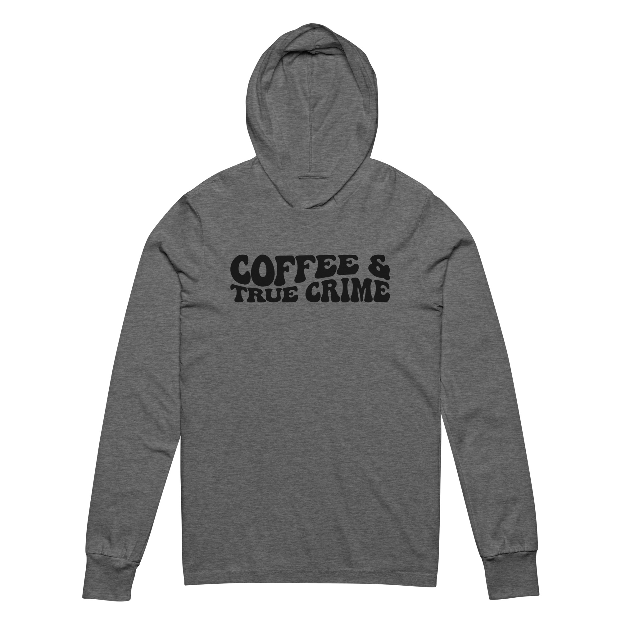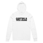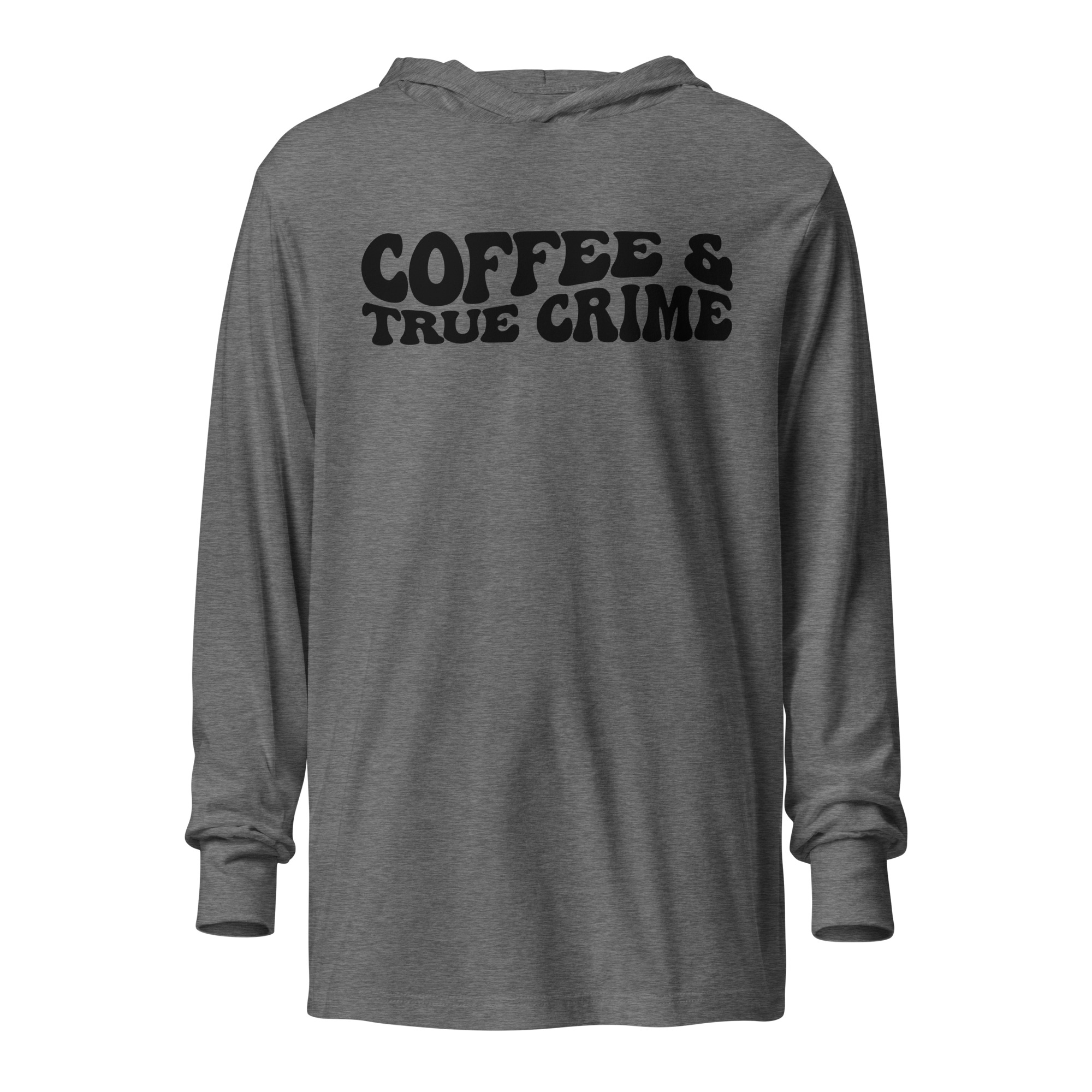 Coffee and true crime, coffee lover, Hooded unisex Long Sleeve Tee. With its long sleeves and comfortable hood, this tee is perfect for layering, allowing you to create stylish outfits all year round. Plus, its lightweight construction allows for unrestricted movement, ensuring that you feel at ease no matter the occasion.