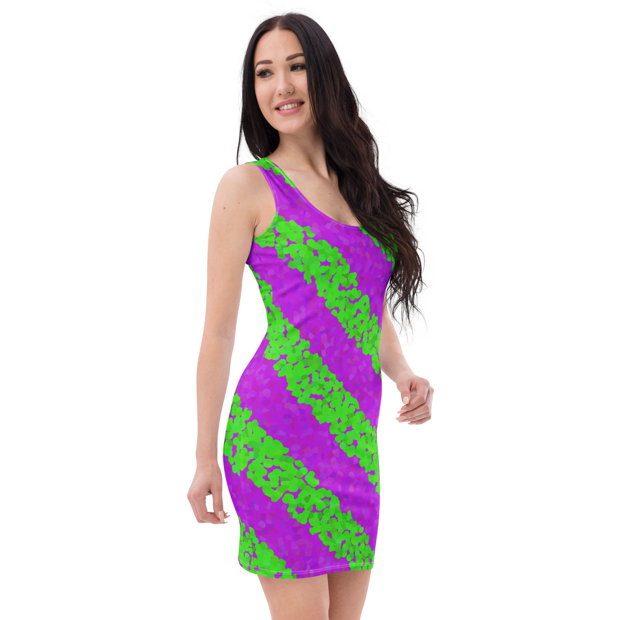 Green and Pink dot stripes All over print Bodycon Dress. Make a statement and look fabulous in this Green and Pink dot stripes, all-over printed, fitted Bodycon dress.