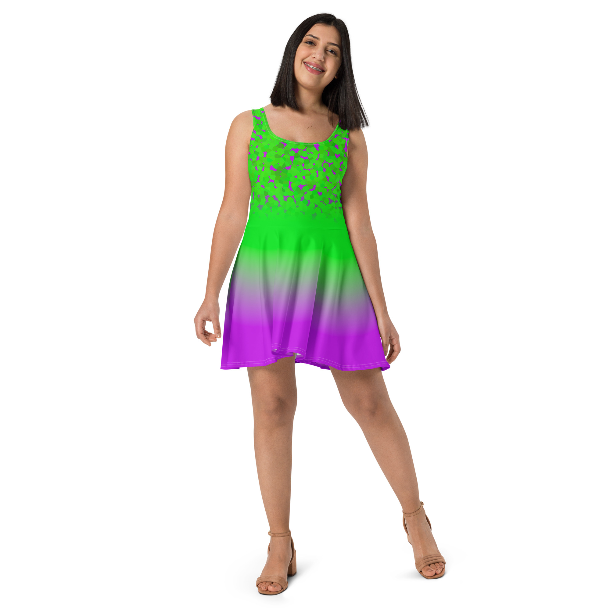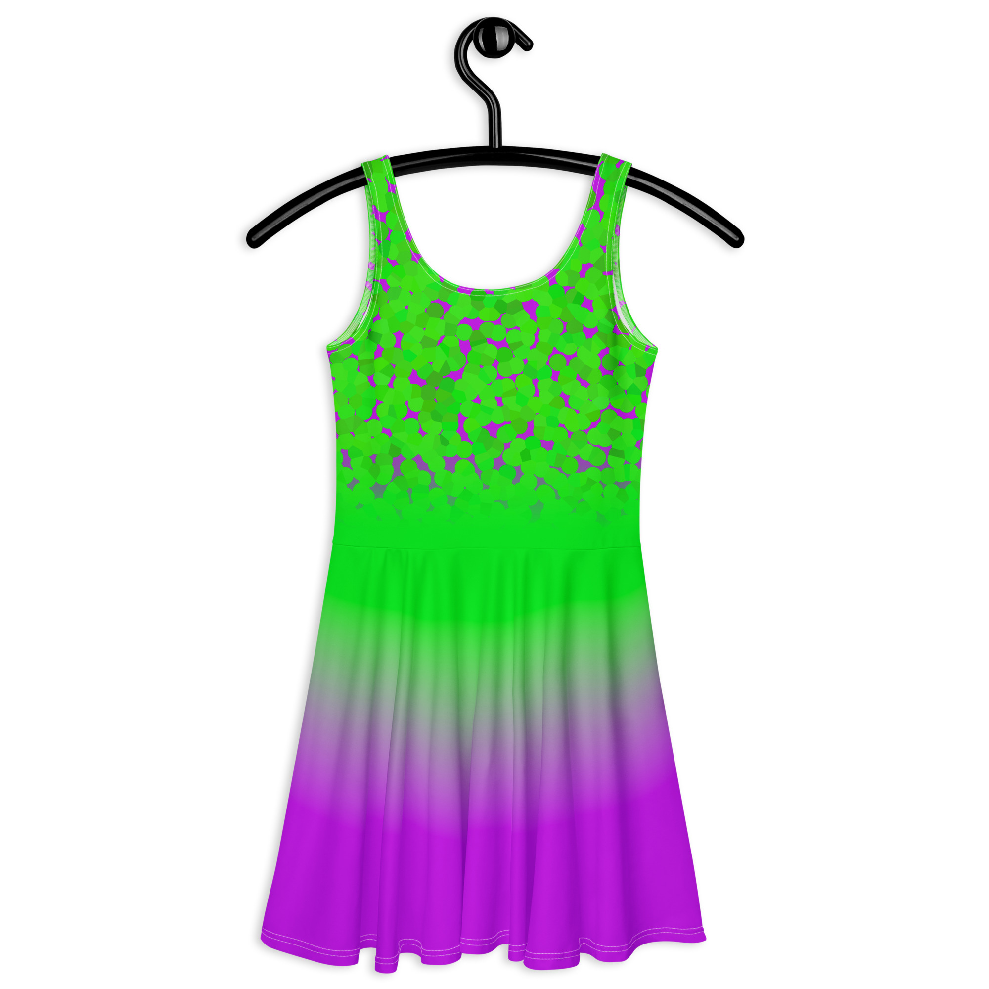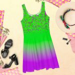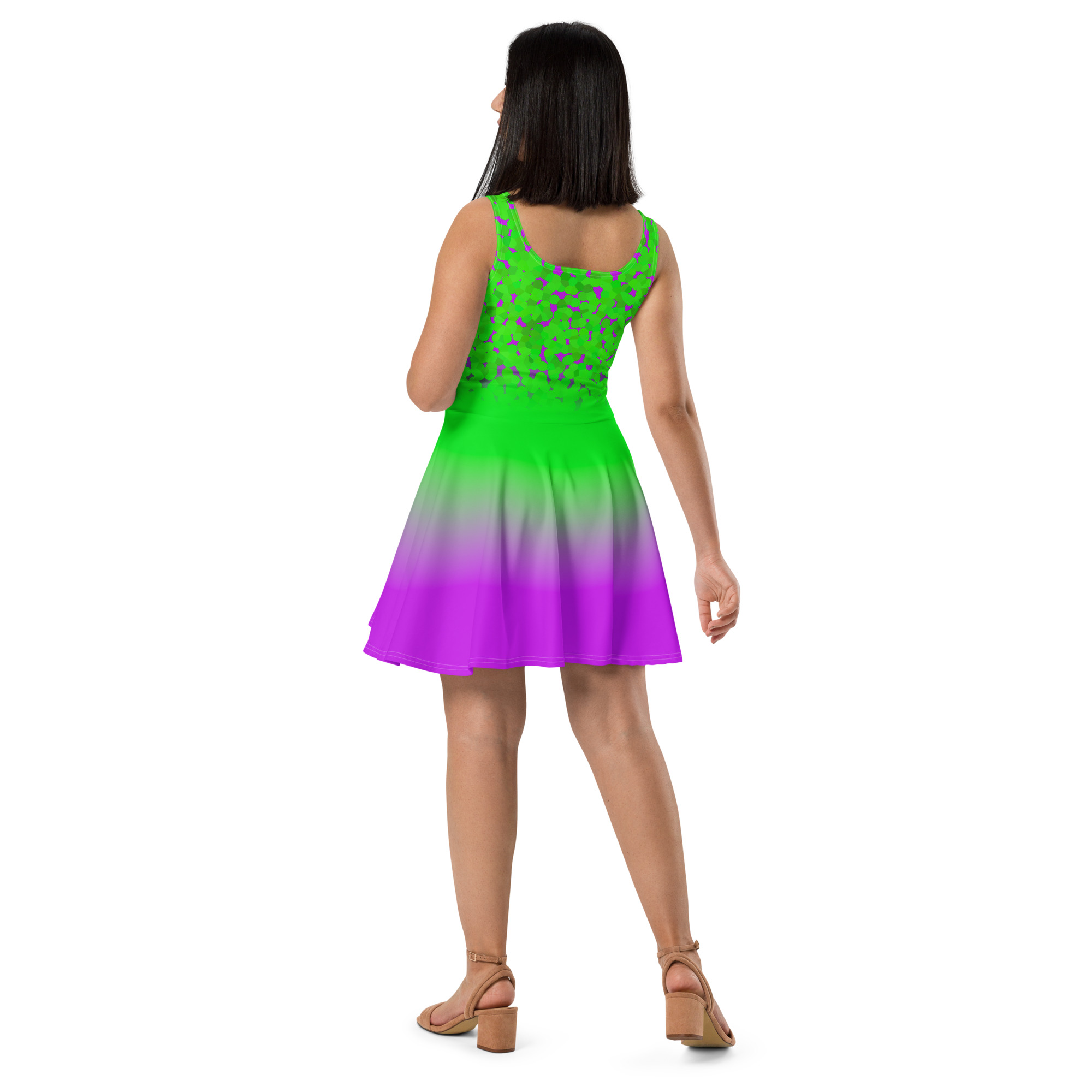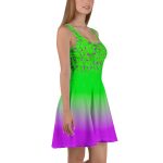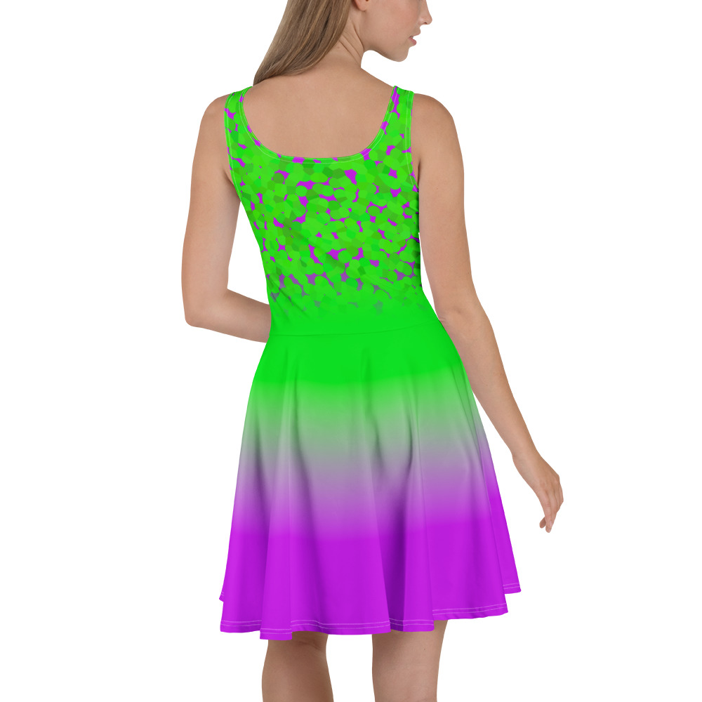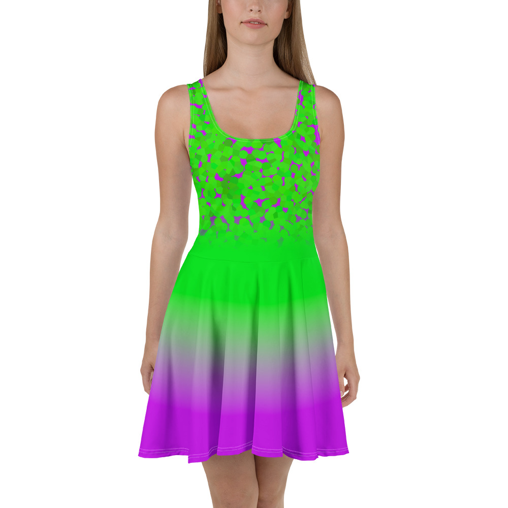 Green to pink gradient design All over print women’s skater dress. Dress to impress with this sleeveless skater dress! The soft fabric and flared skirt give it an elegant twist that brings out the intricate design with a beautiful vibrancy.