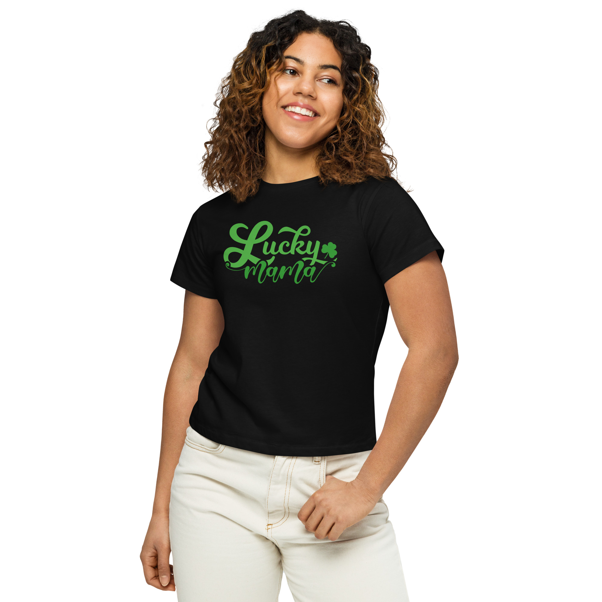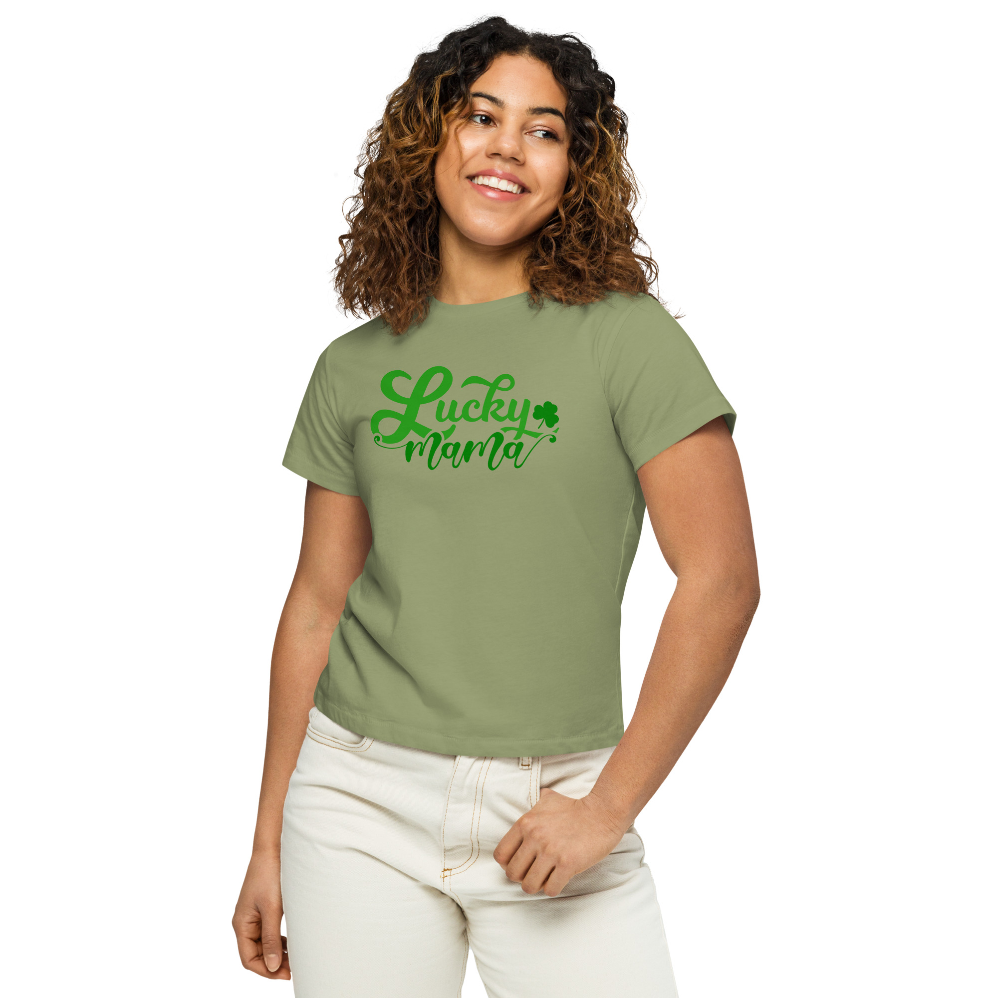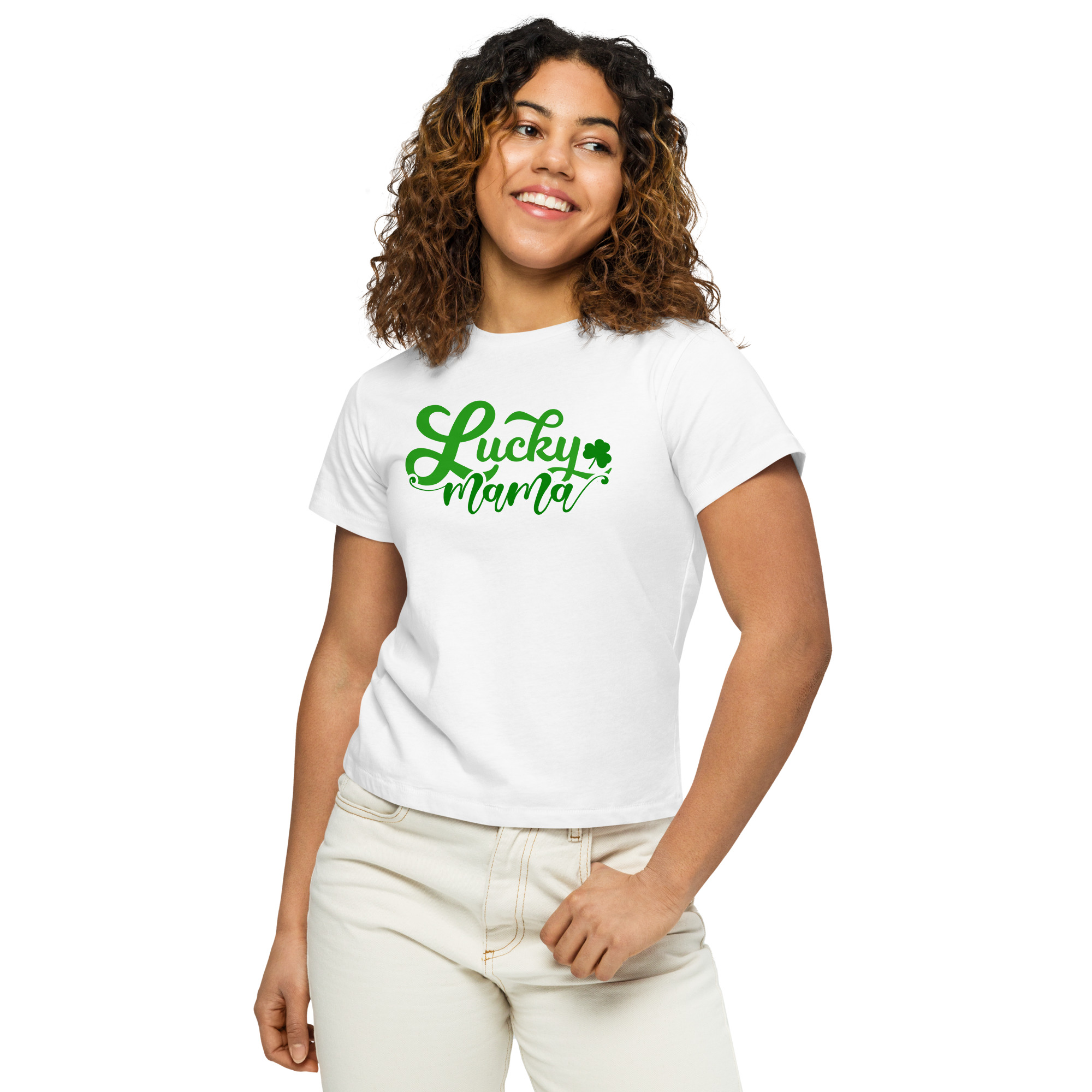 Lucky Mama, St. Patrick’s Day Women’s high-waisted t-shirt. Made of 100% combed and ring-spun cotton, this t-shirt is ultra soft and smooth against the skin. With its flattering, longline fit and crew neck, this tee will look best paired with high-waisted bottoms.