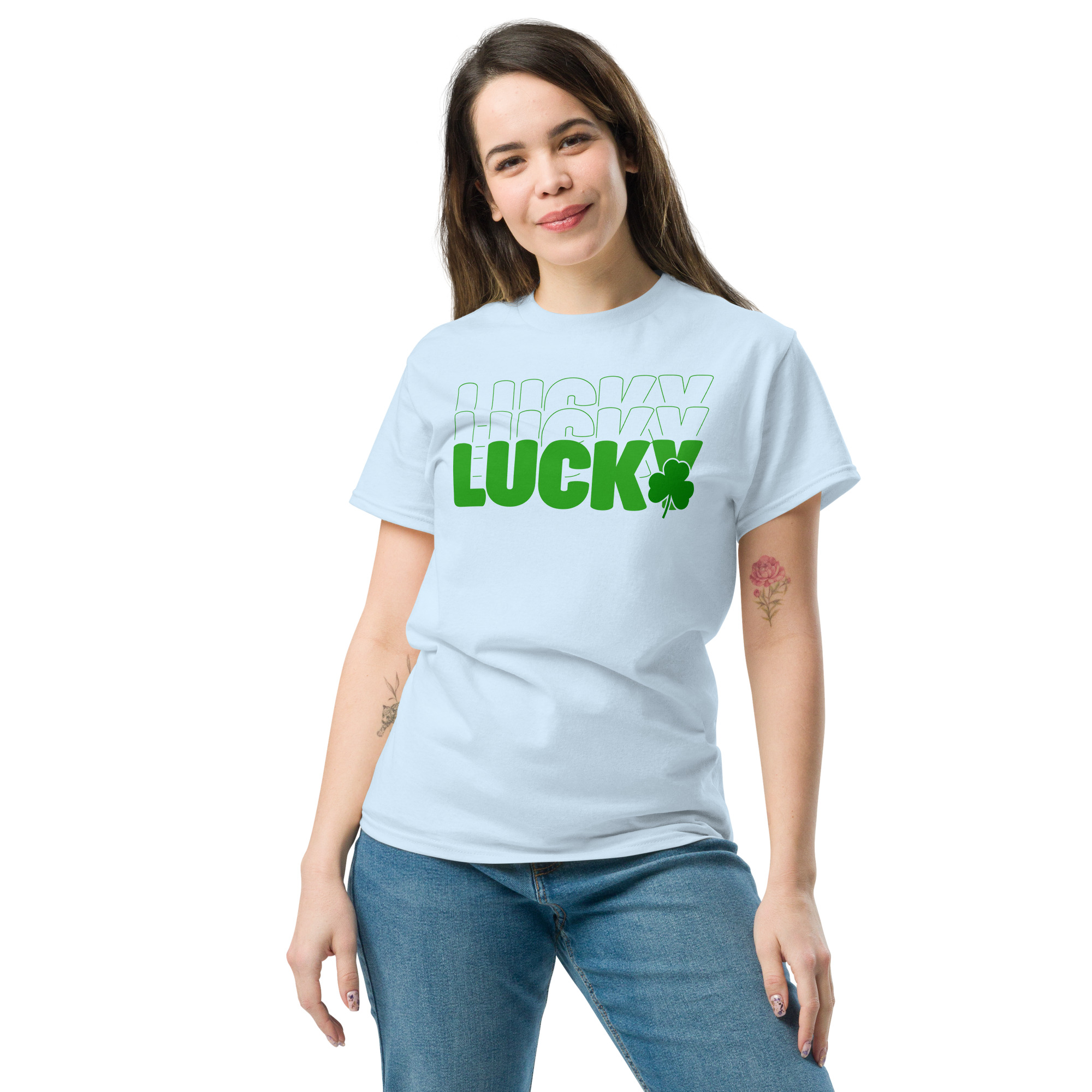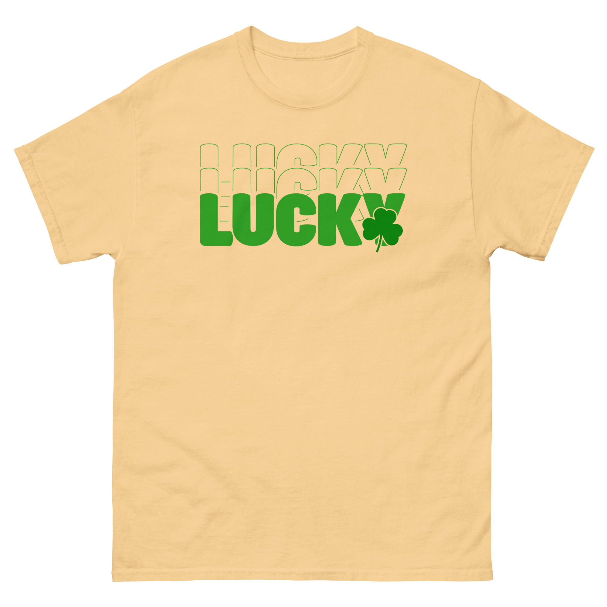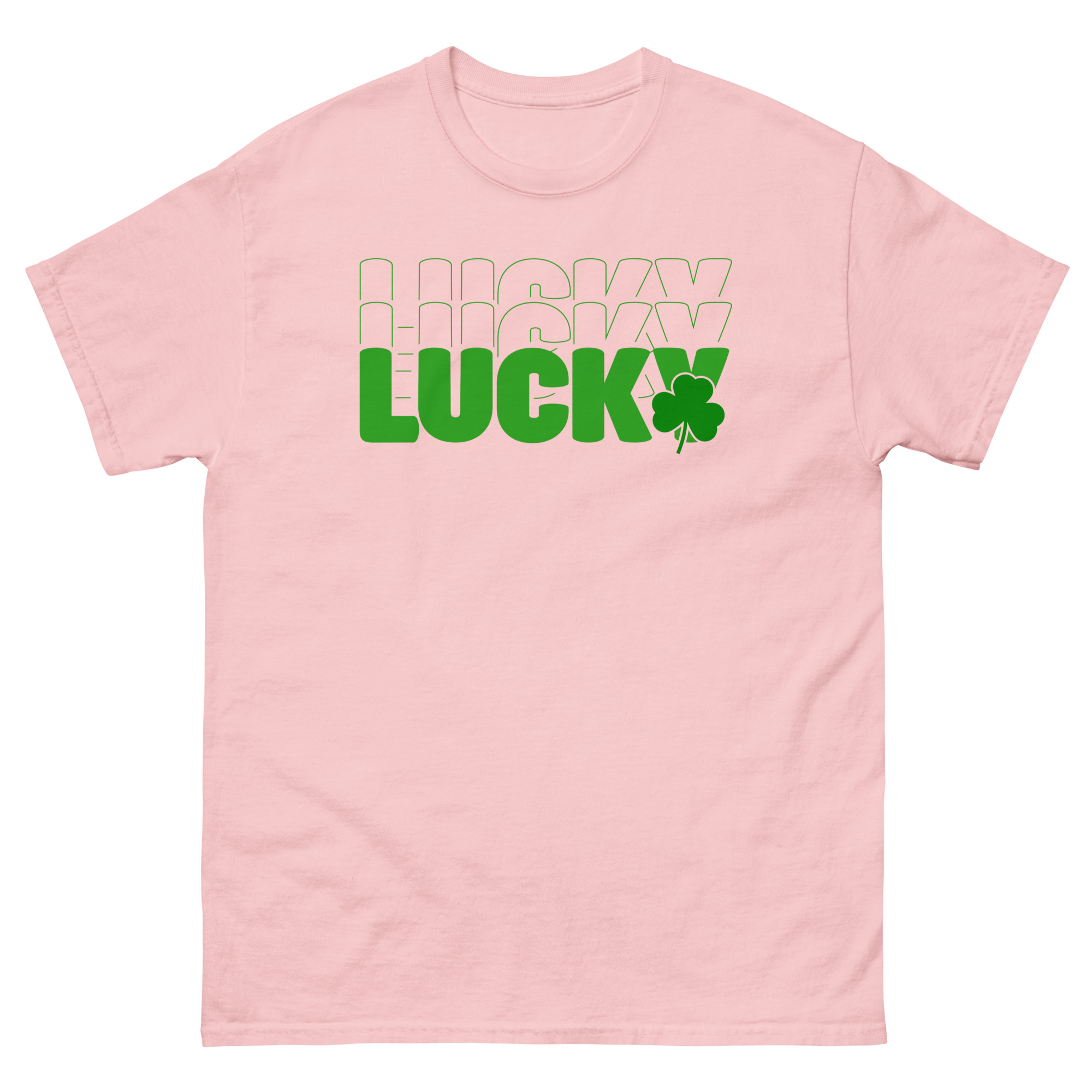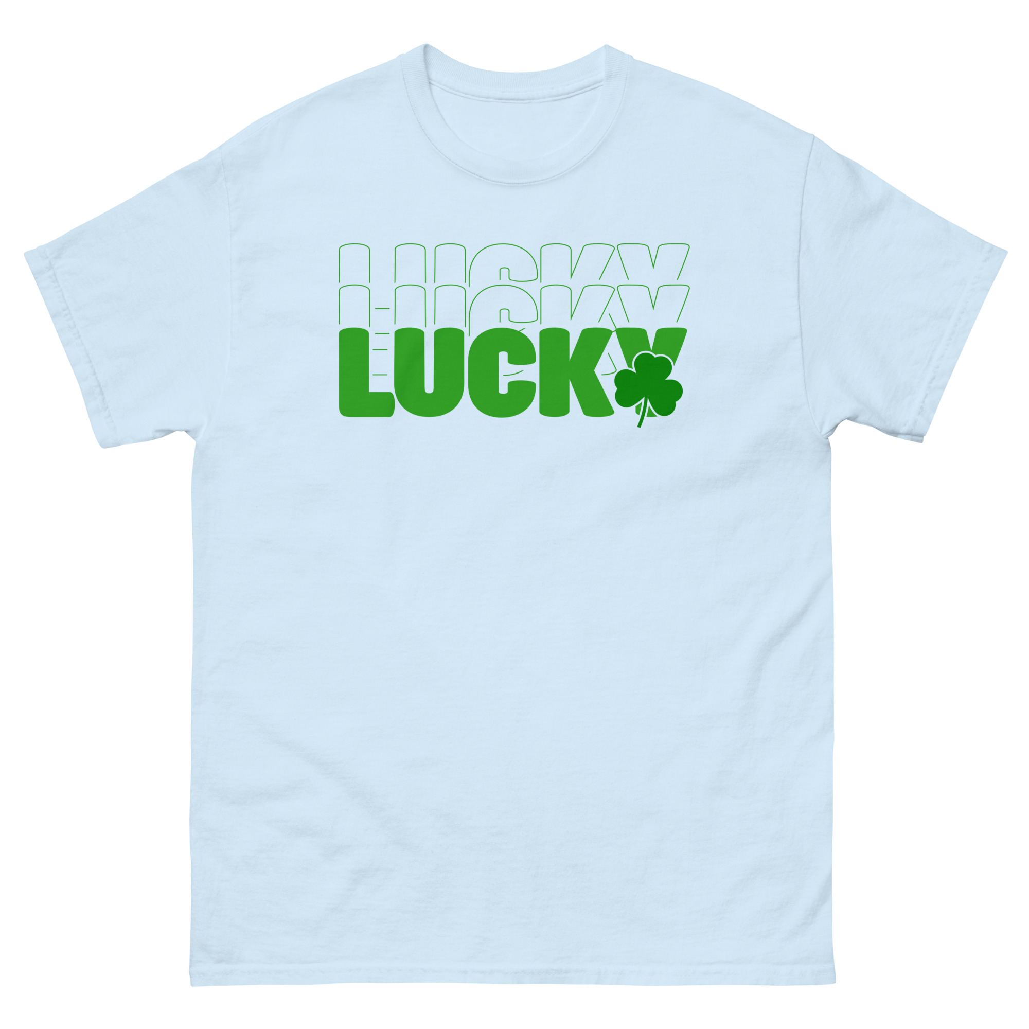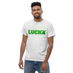 Lucky outline text, clover St. Patrick’s Day Unisex classic tee. The 100% cotton unisex classic tee will help you land a more structured look. It sits nicely, maintains sharp lines around the edges, and goes perfectly with layered streetwear outfits. Plus, it’s extra trendy now!
