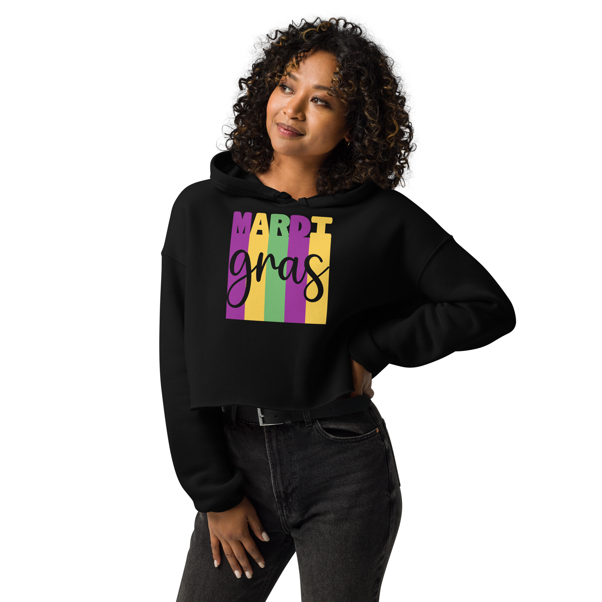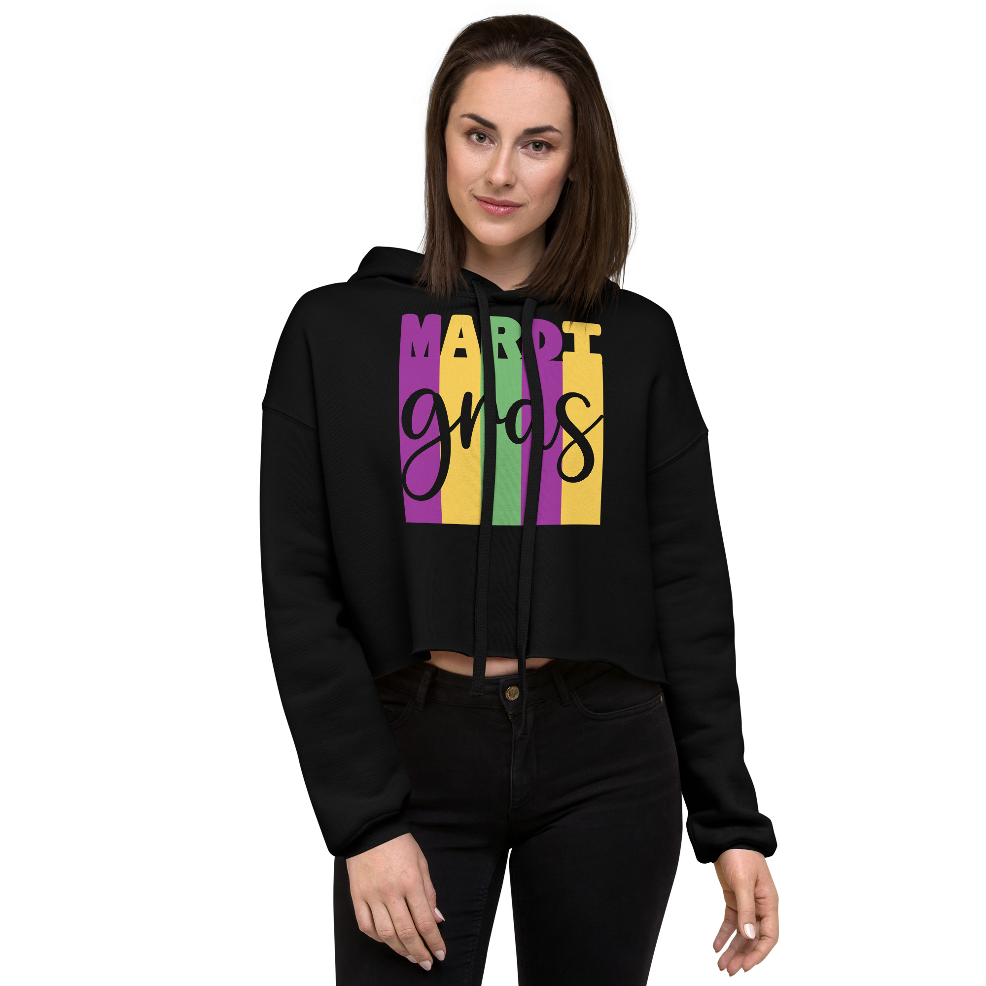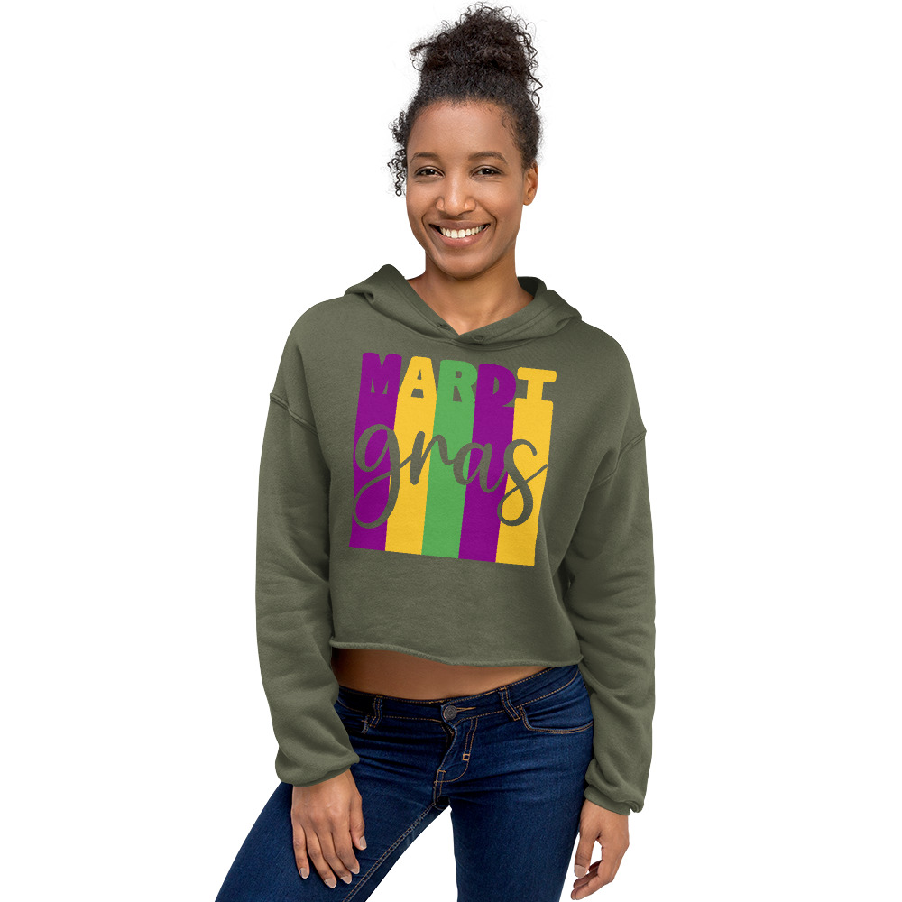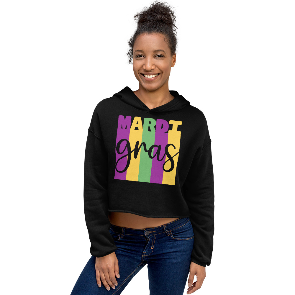 Mardi Gras, Mardi gras party Women’s Crop Hoodie Let fashion take over your wardrobe with this great statement piece. The trendy raw hem and matching drawstrings means that this hoodie is bound to become a true favorite.