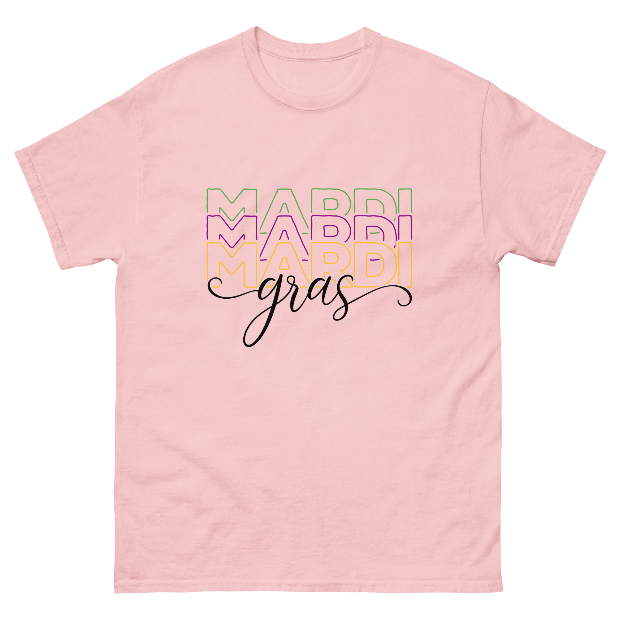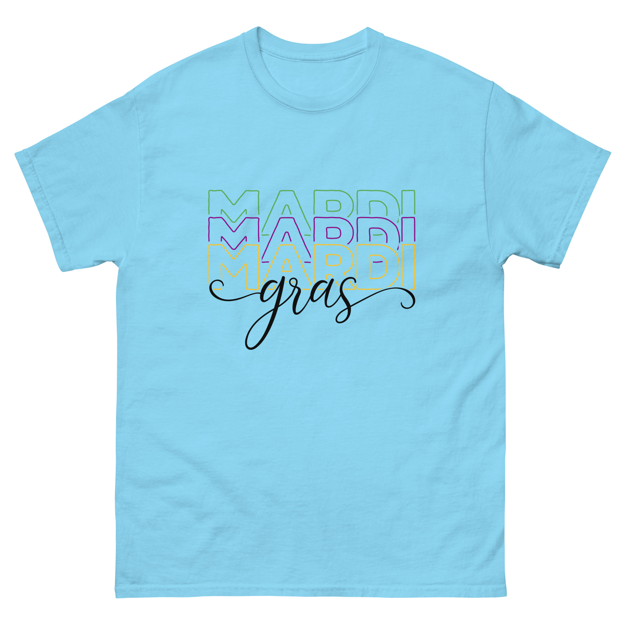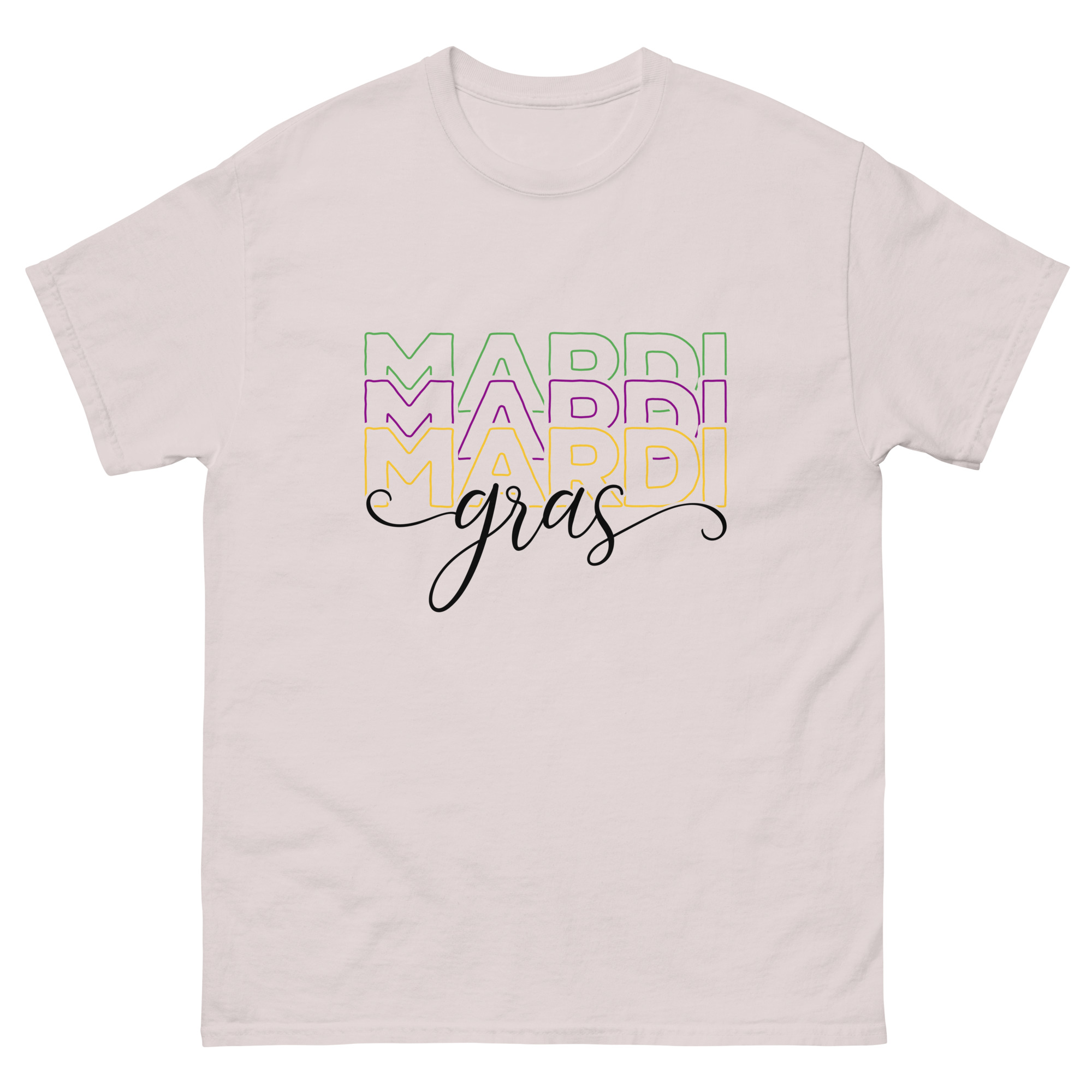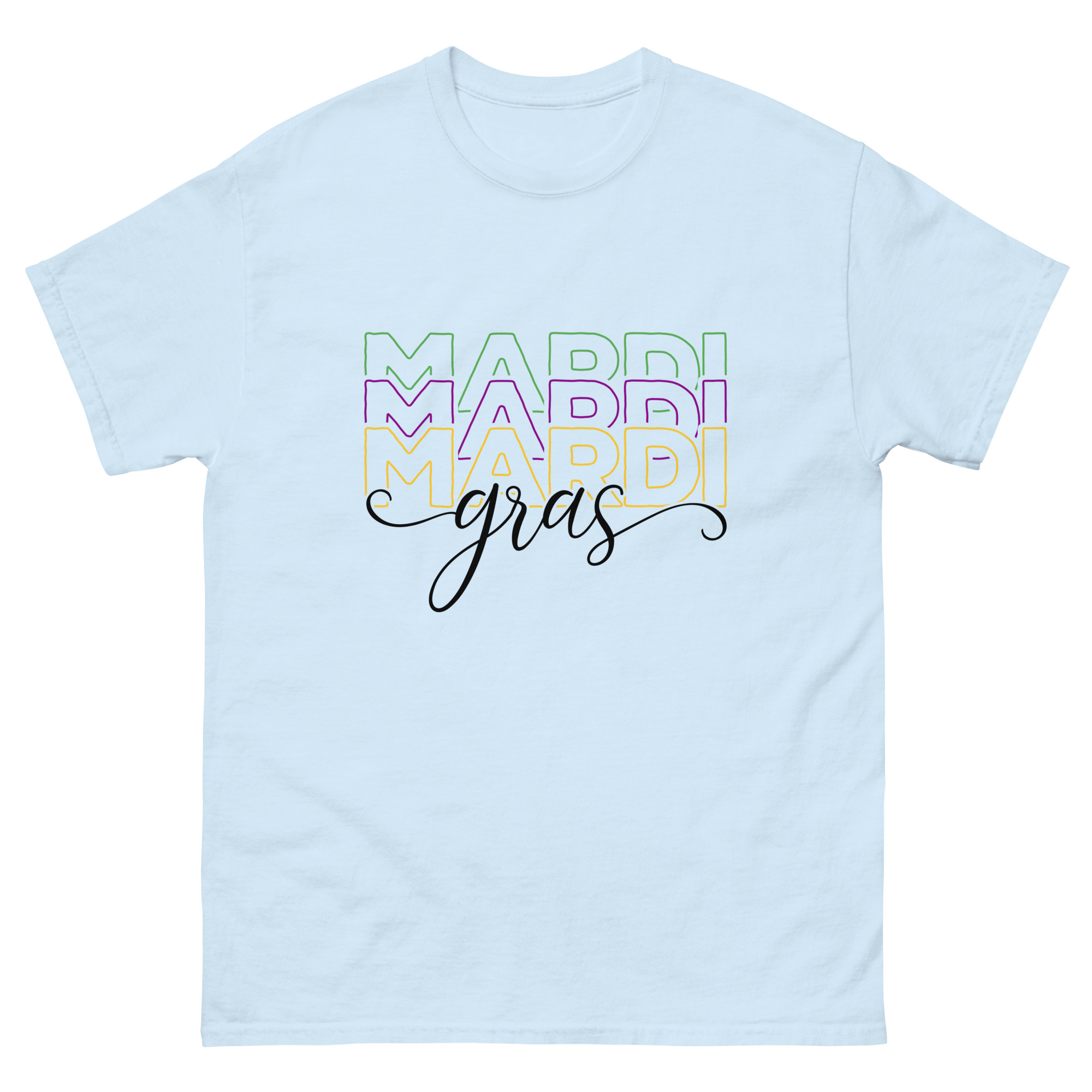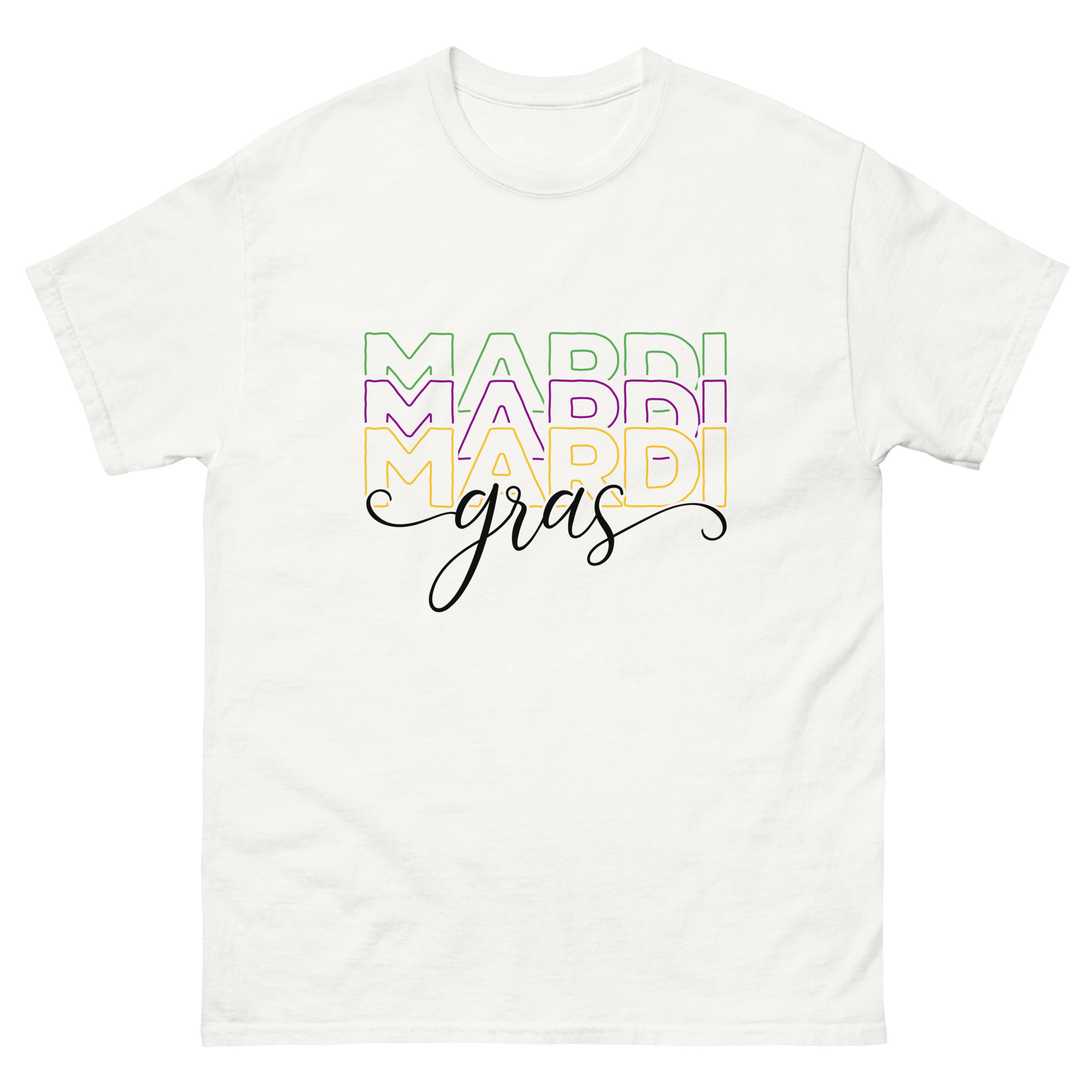 Mardi Gras outline text, Mardi Gras parade Unisex classic tee. The 100% cotton unisex classic tee will help you land a more structured look. It sits nicely, maintains sharp lines around the edges, and goes perfectly with layered streetwear outfits. Plus, it’s extra trendy now!