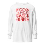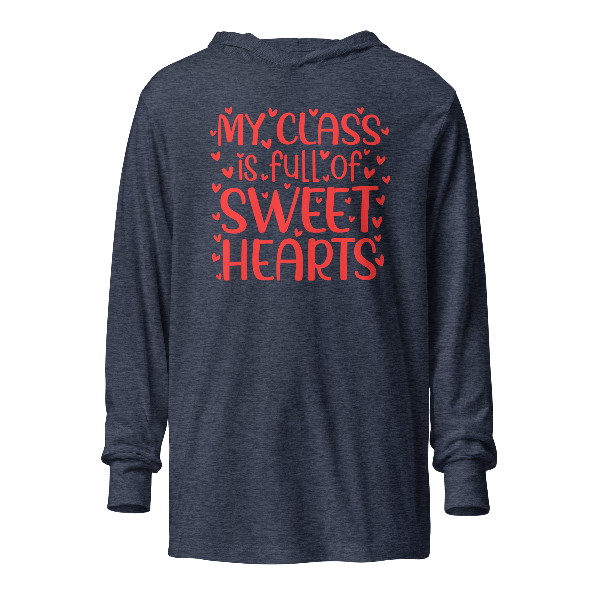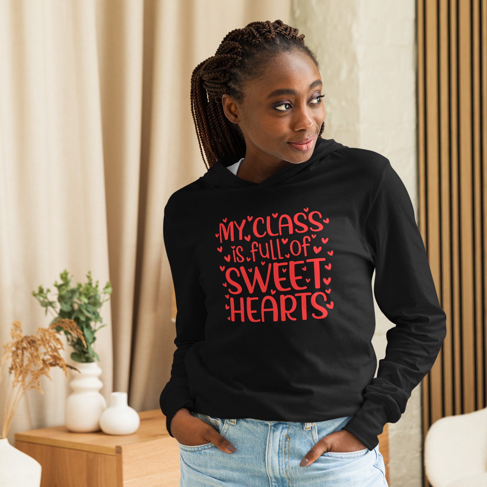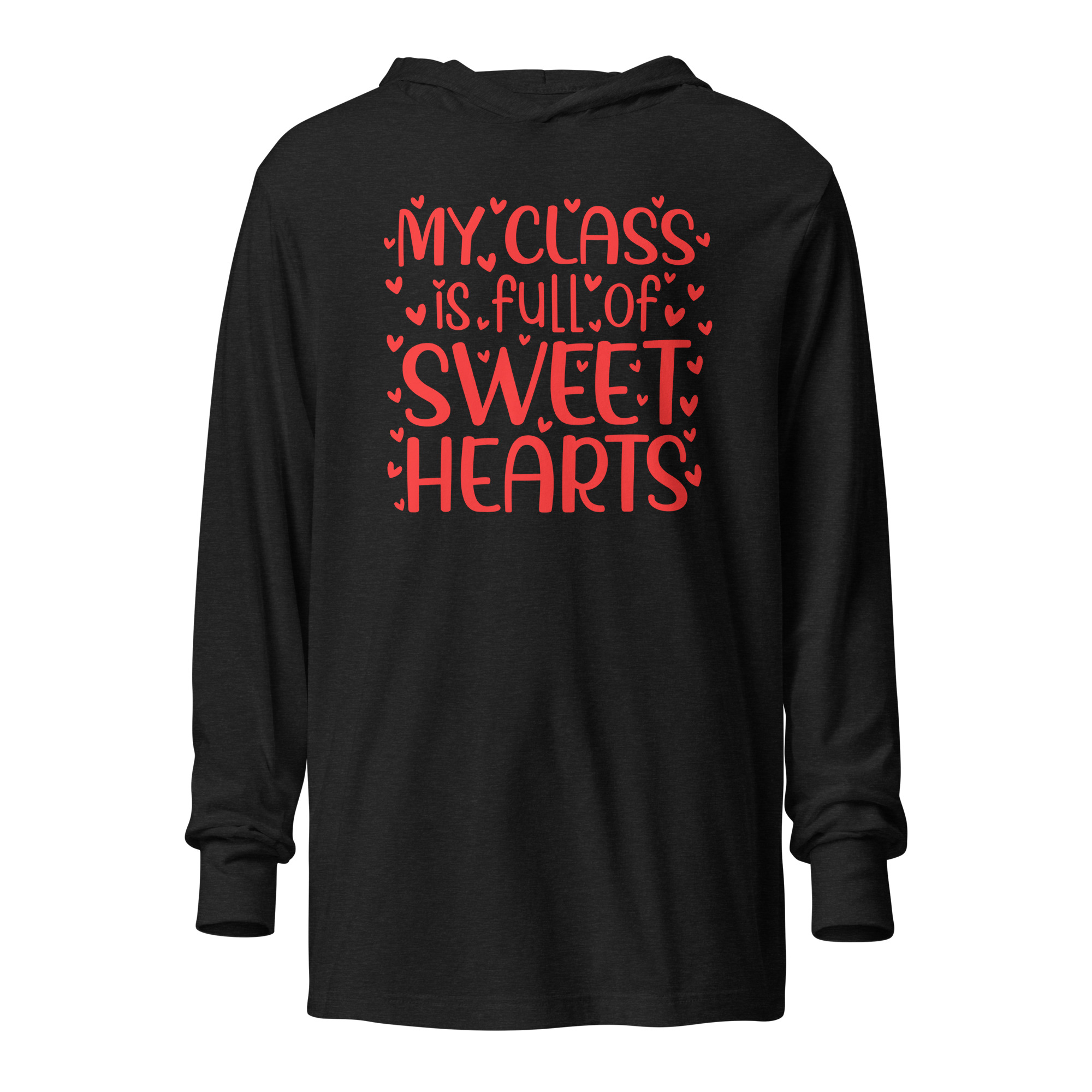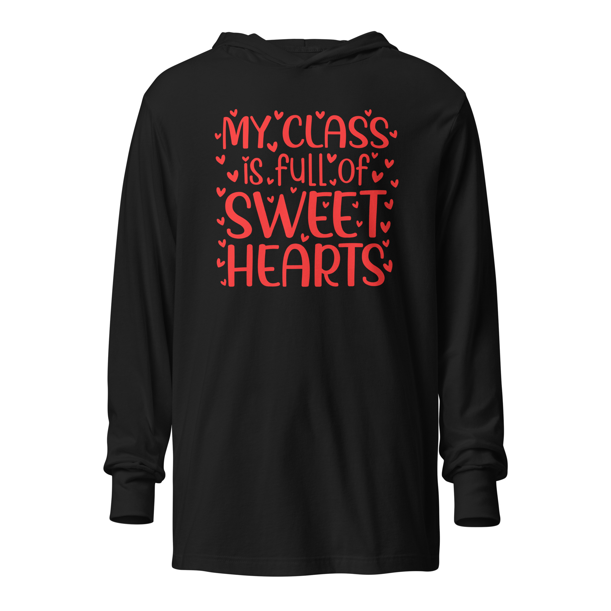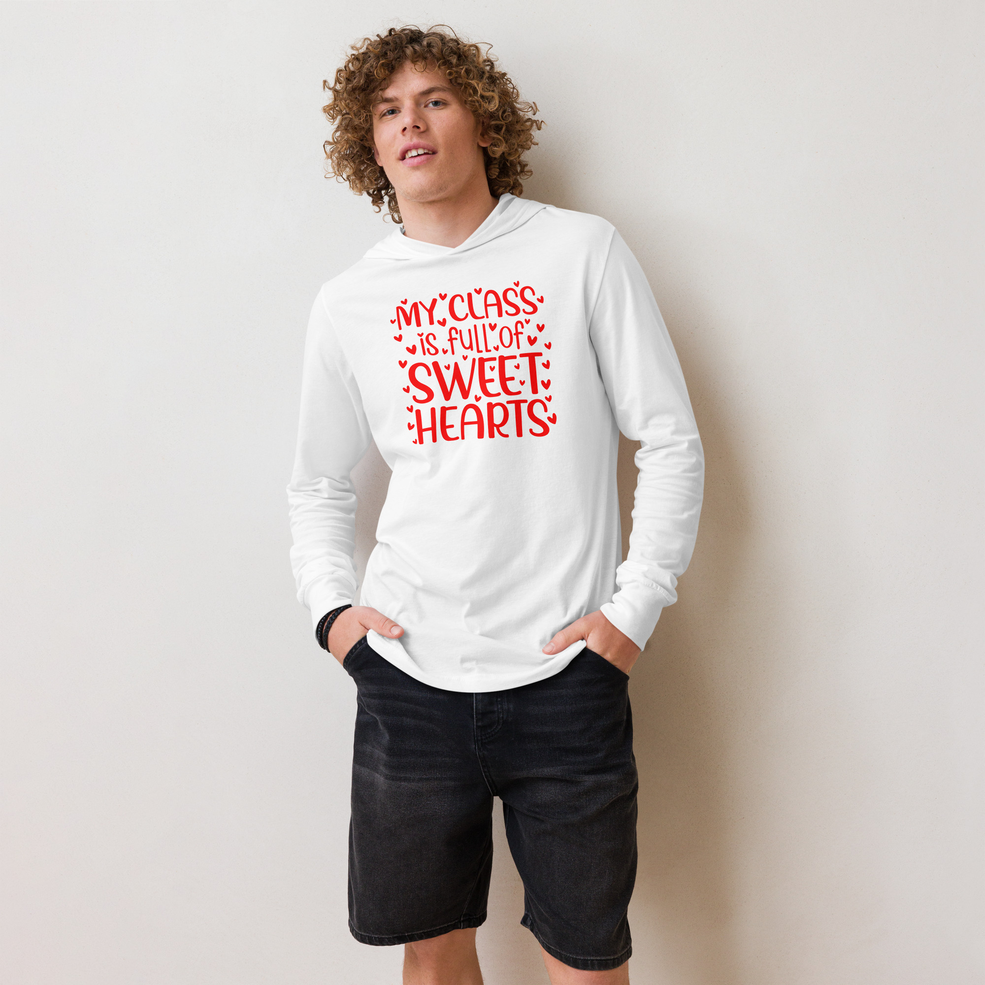 My Class is full of sweet hearts. Valentine day Hooded Long Sleeve Tee. Hooded long-sleeve tee With its long sleeves and comfortable hood, this tee is perfect for layering, allowing you to create stylish outfits all year round. Plus, its lightweight construction allows for unrestricted movement, ensuring that you feel at ease no matter the occasion.