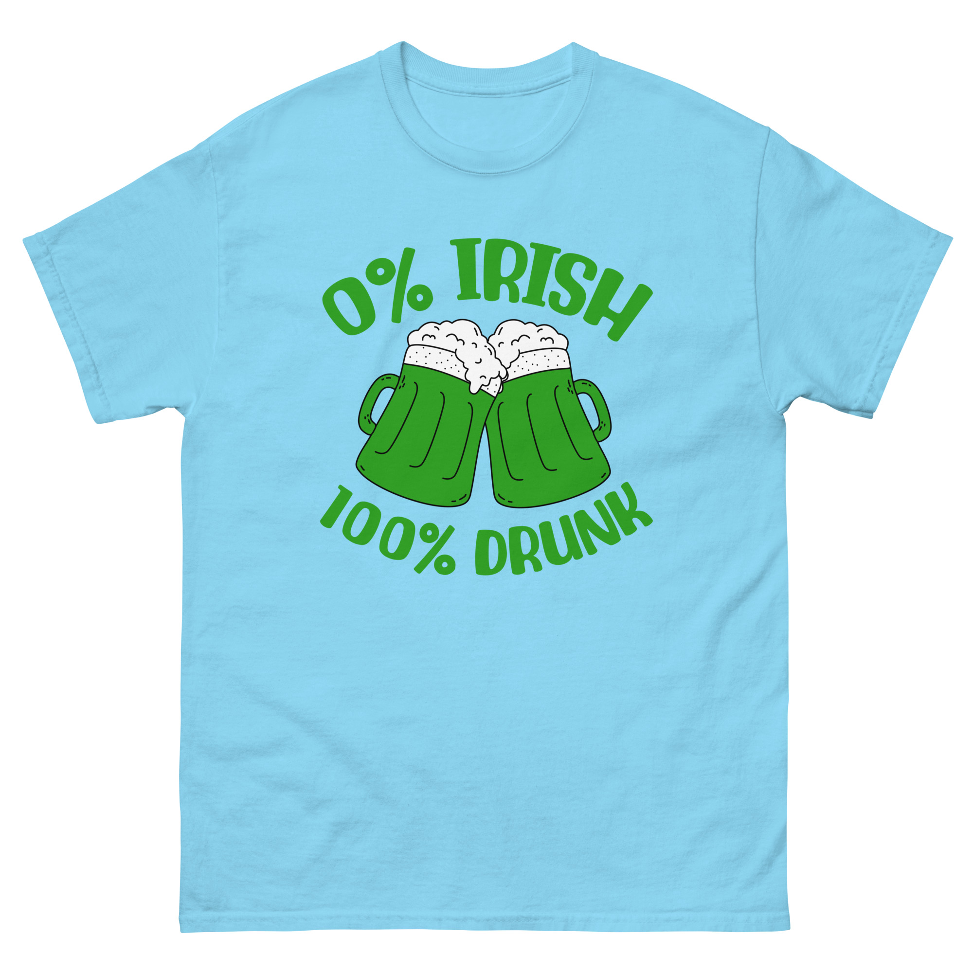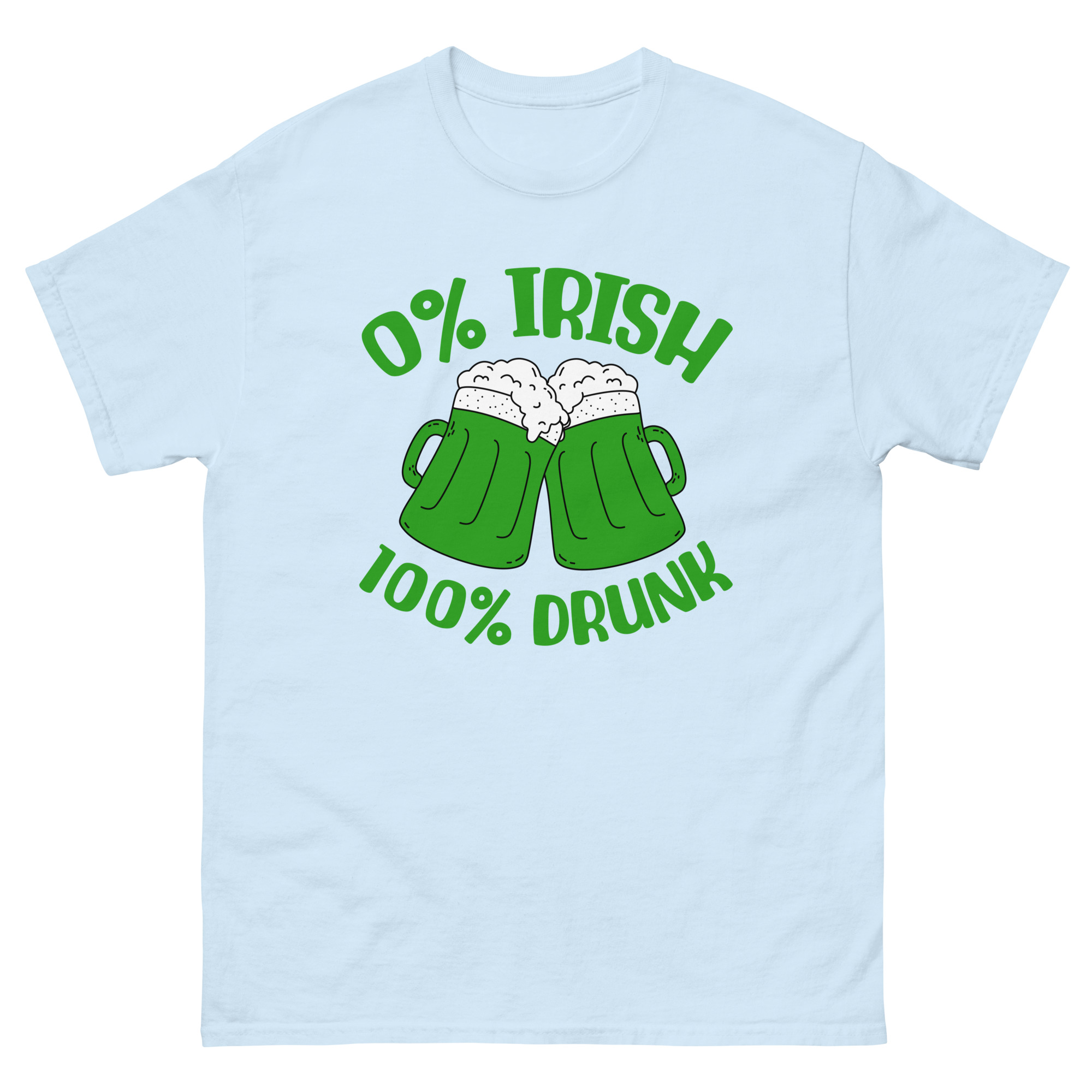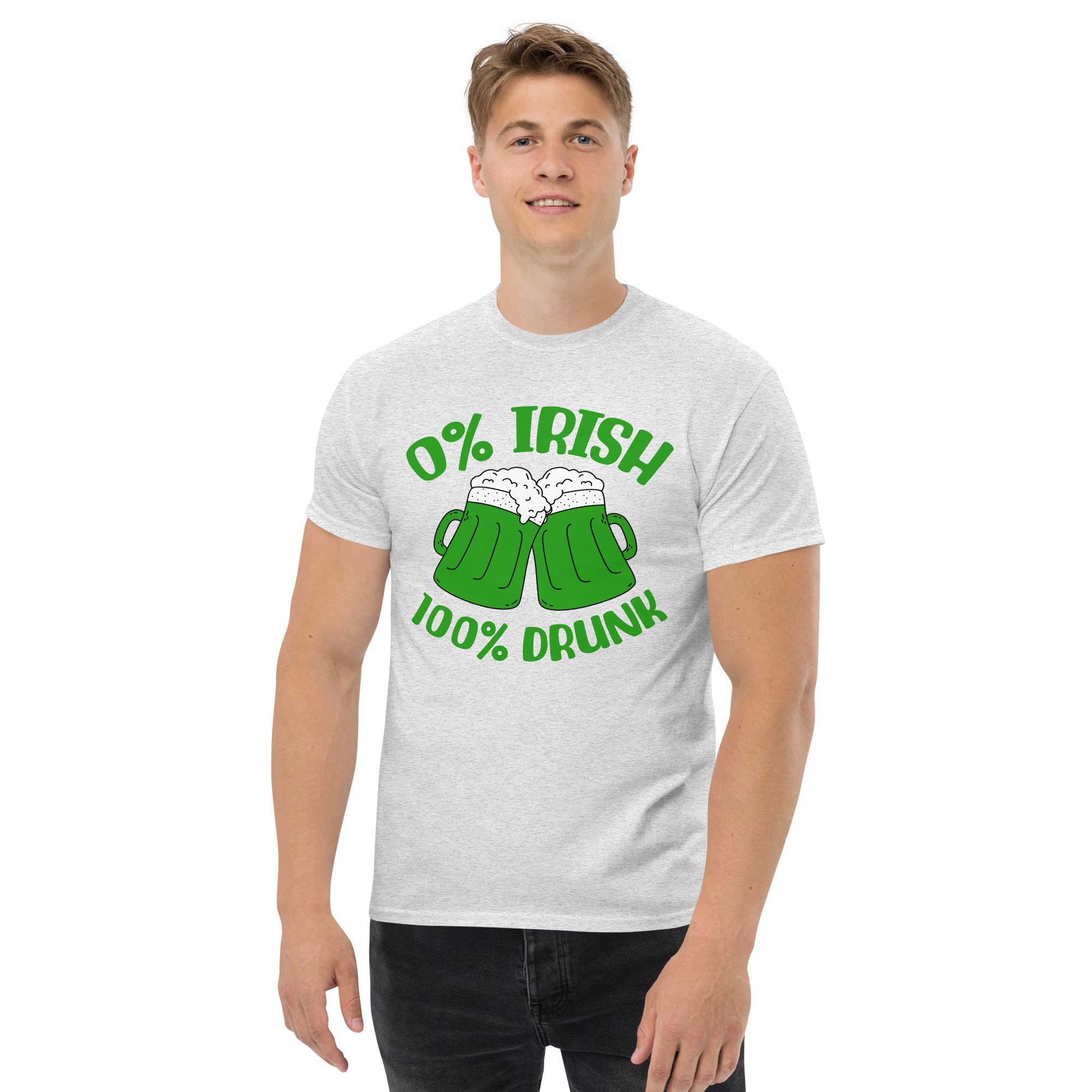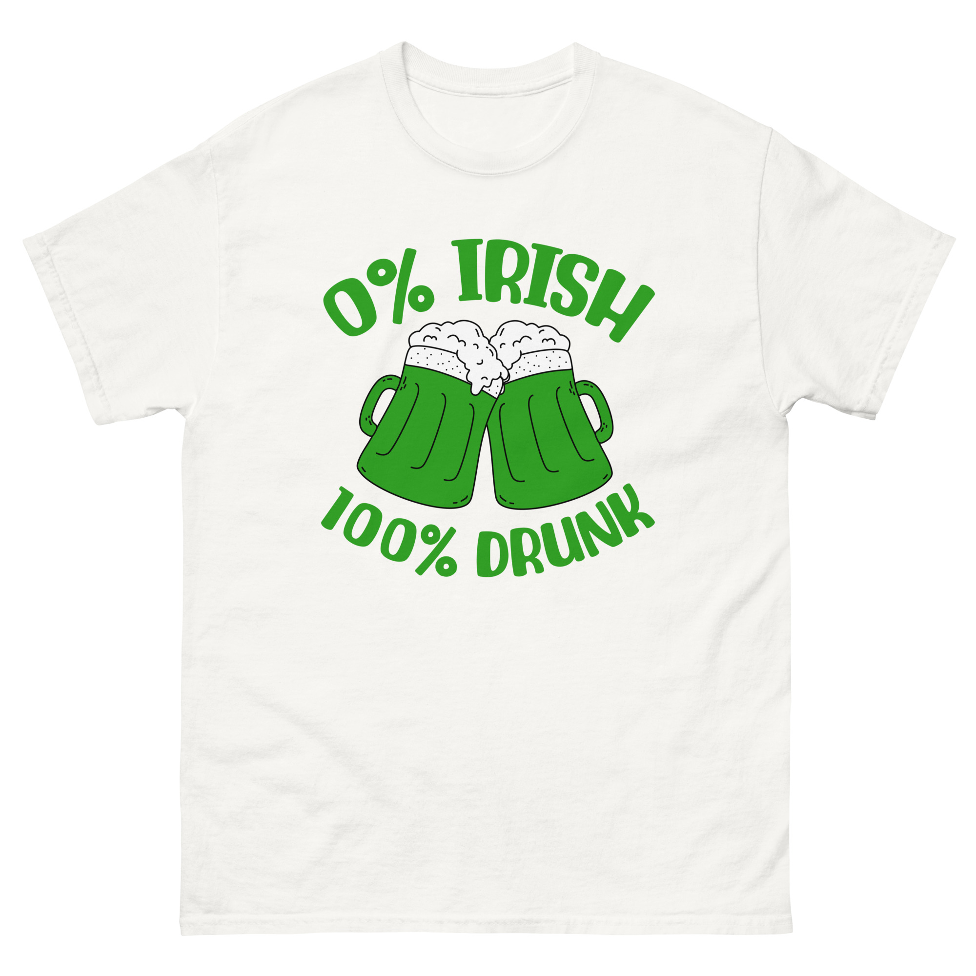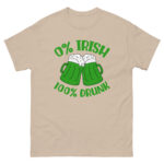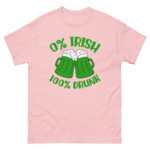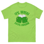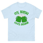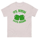 St. Patrick’s Day, 0% Irish 100% drunk, Party shirt, Unisex classic tee. The 100% cotton unisex classic tee will help you land a more structured look. It sits nicely, maintains sharp lines around the edges, and goes perfectly with layered streetwear outfits. Plus, it’s extra trendy now!