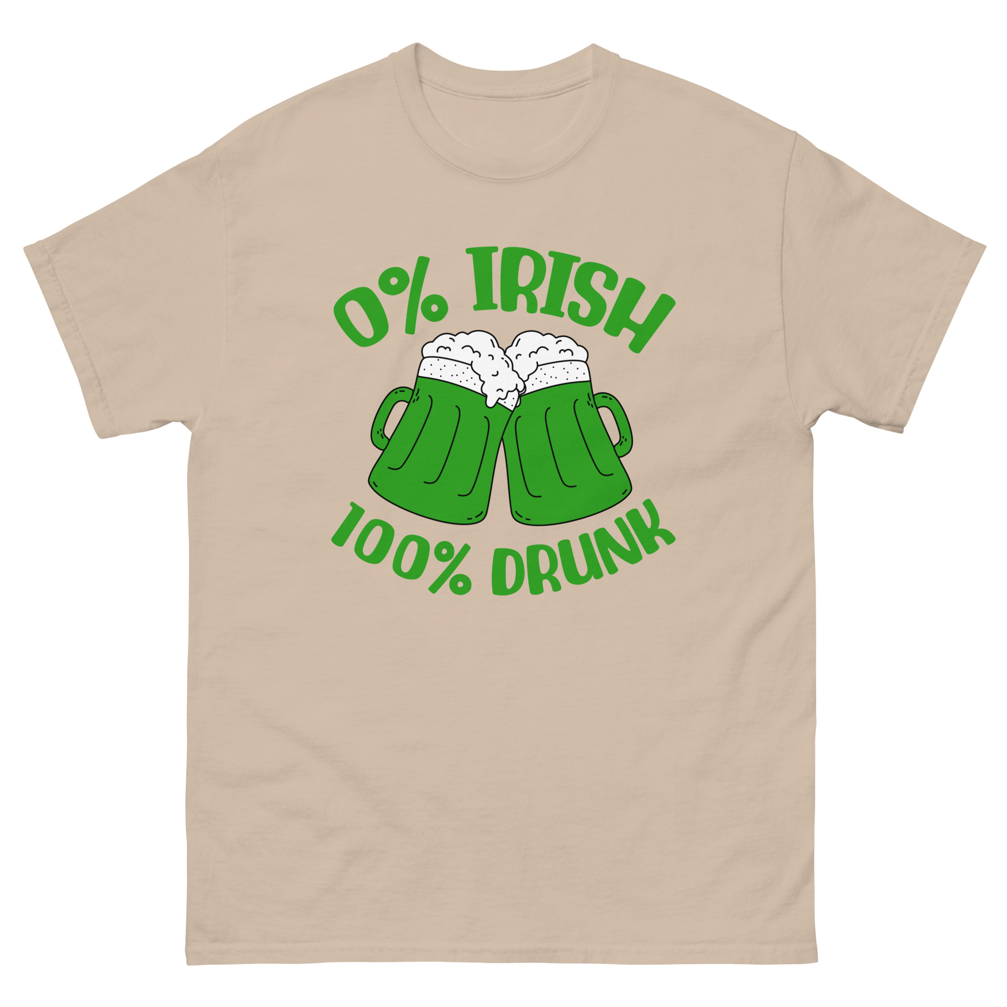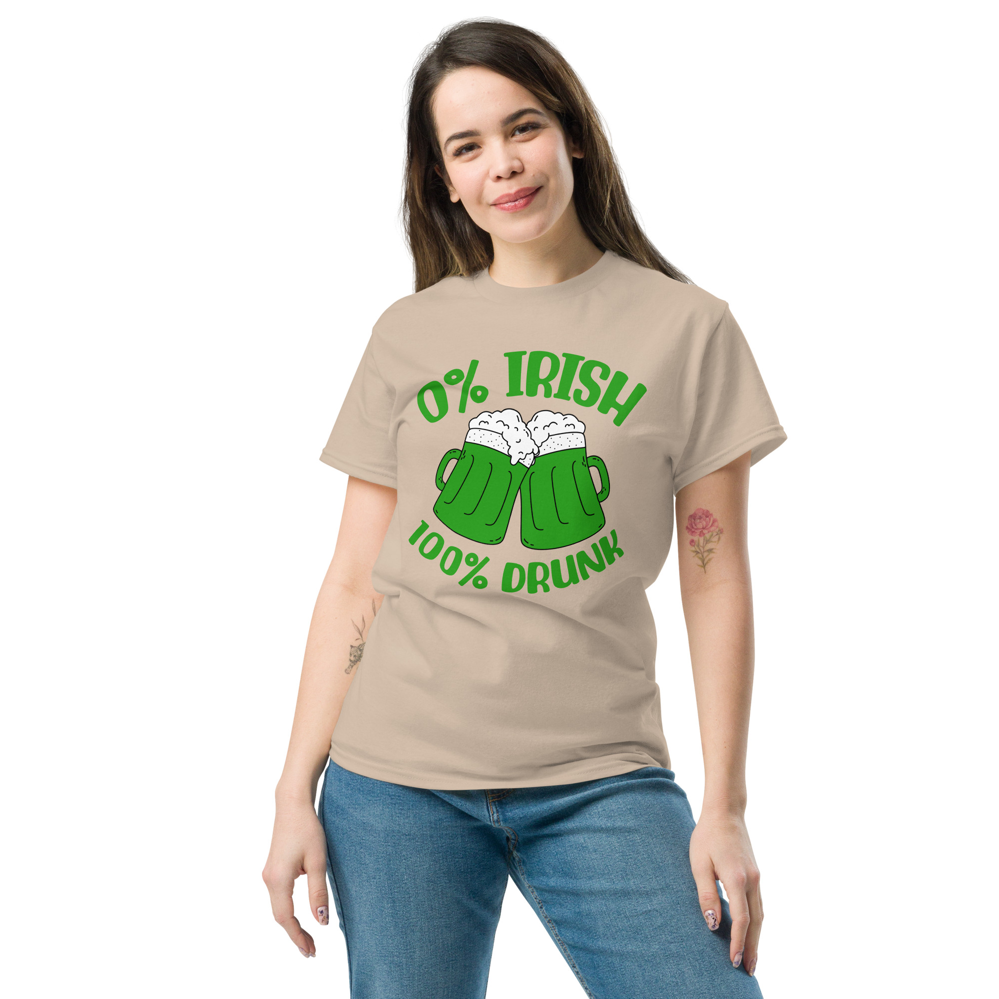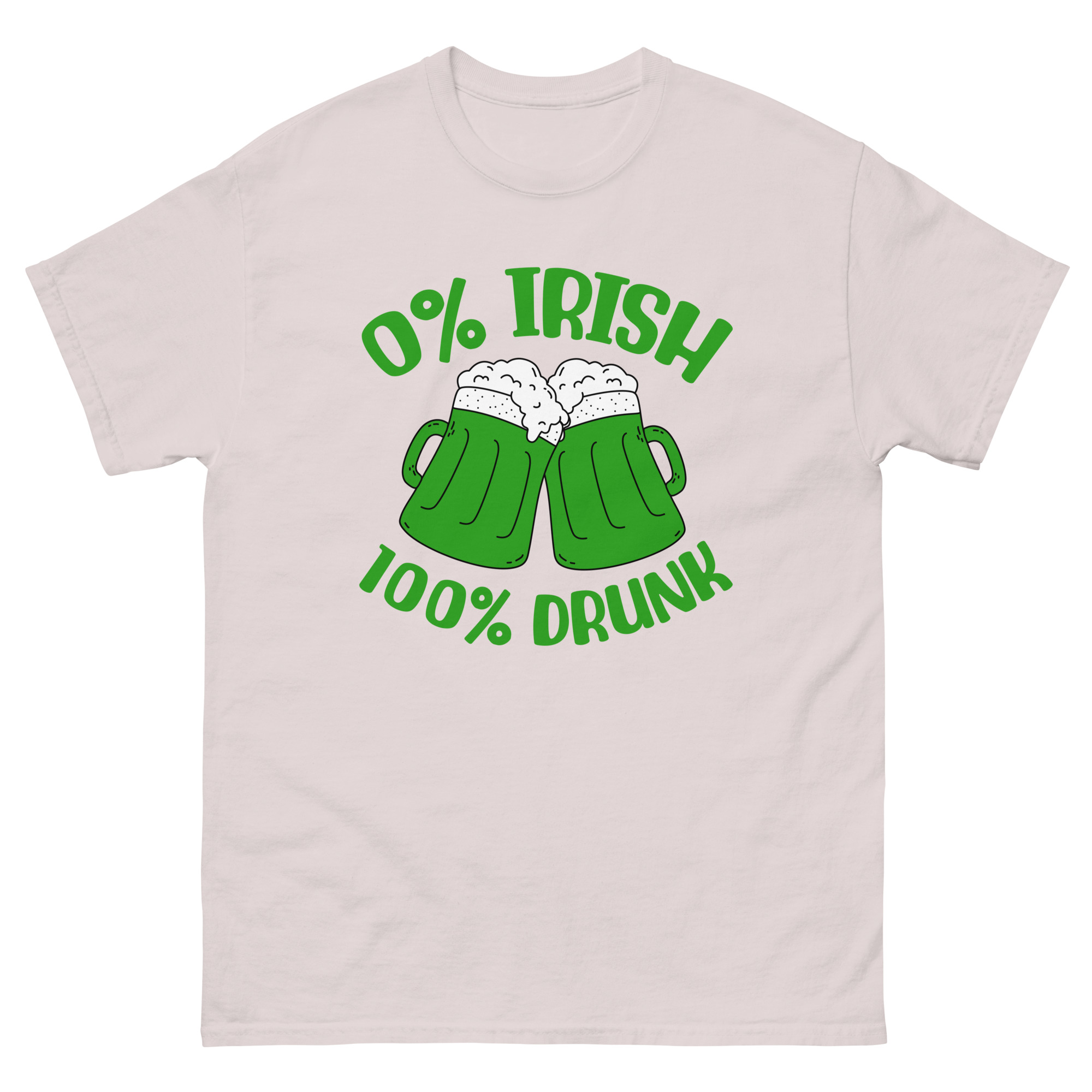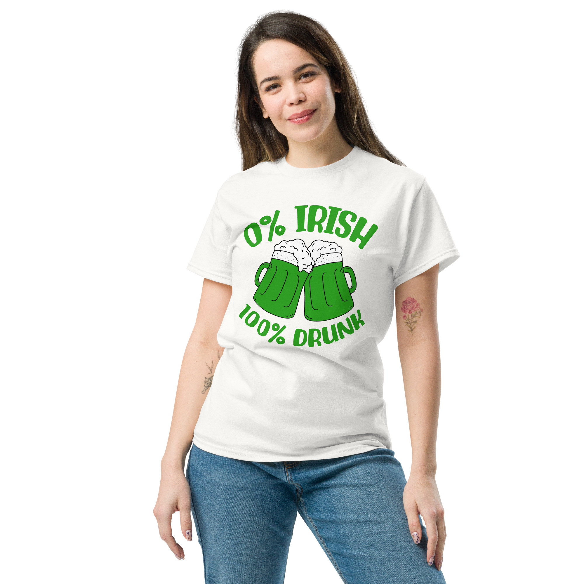 St. Patrick’s Day, 0% Irish 100% drunk, Party shirt, Unisex classic tee. The 100% cotton unisex classic tee will help you land a more structured look. It sits nicely, maintains sharp lines around the edges, and goes perfectly with layered streetwear outfits. Plus, it’s extra trendy now!